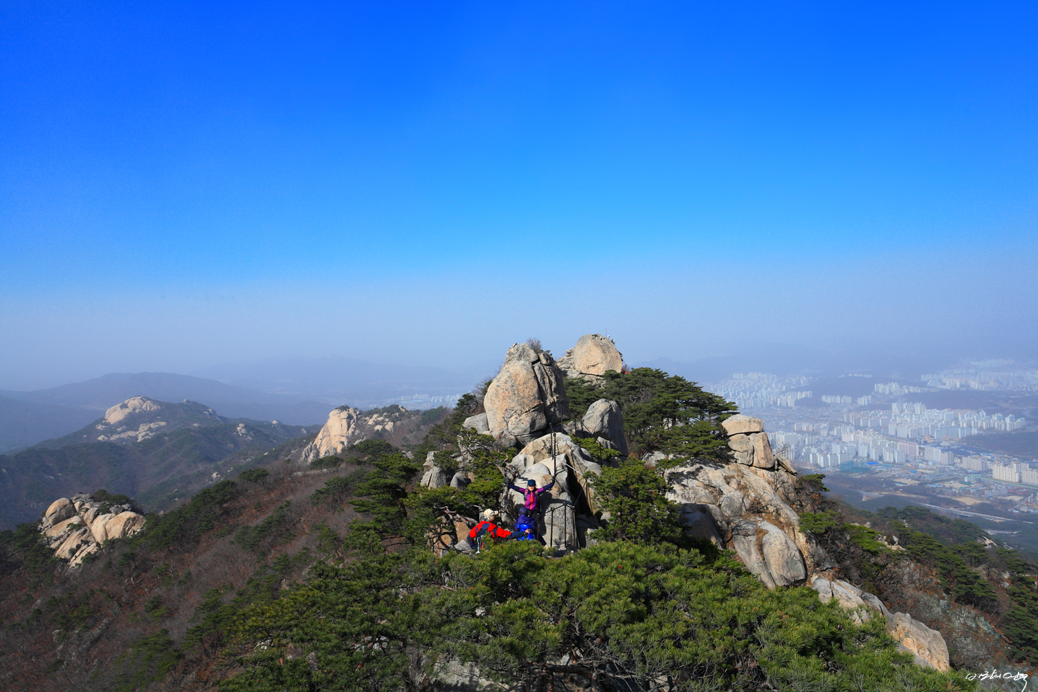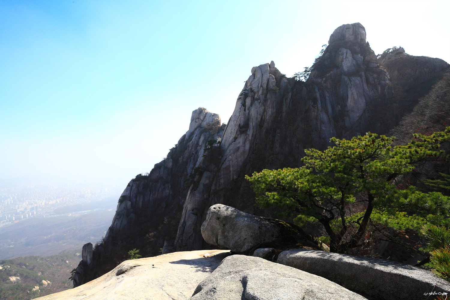 물개바위 정상에서 마주보는 칼바위와 오른쪽 멀리 우이암입니다.