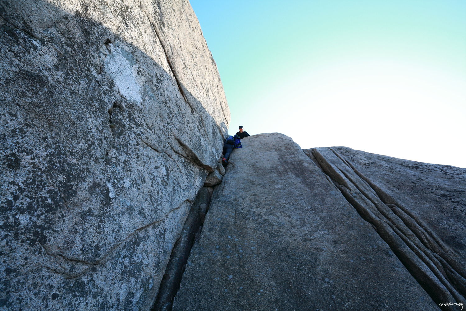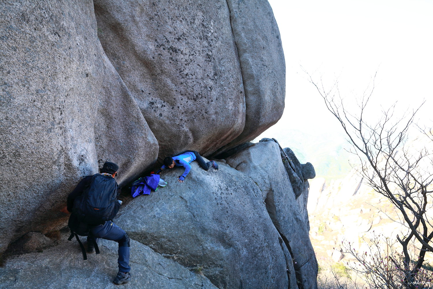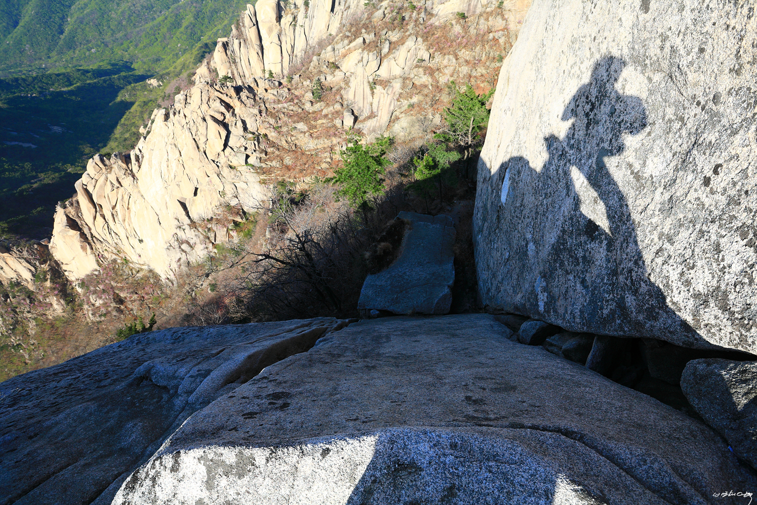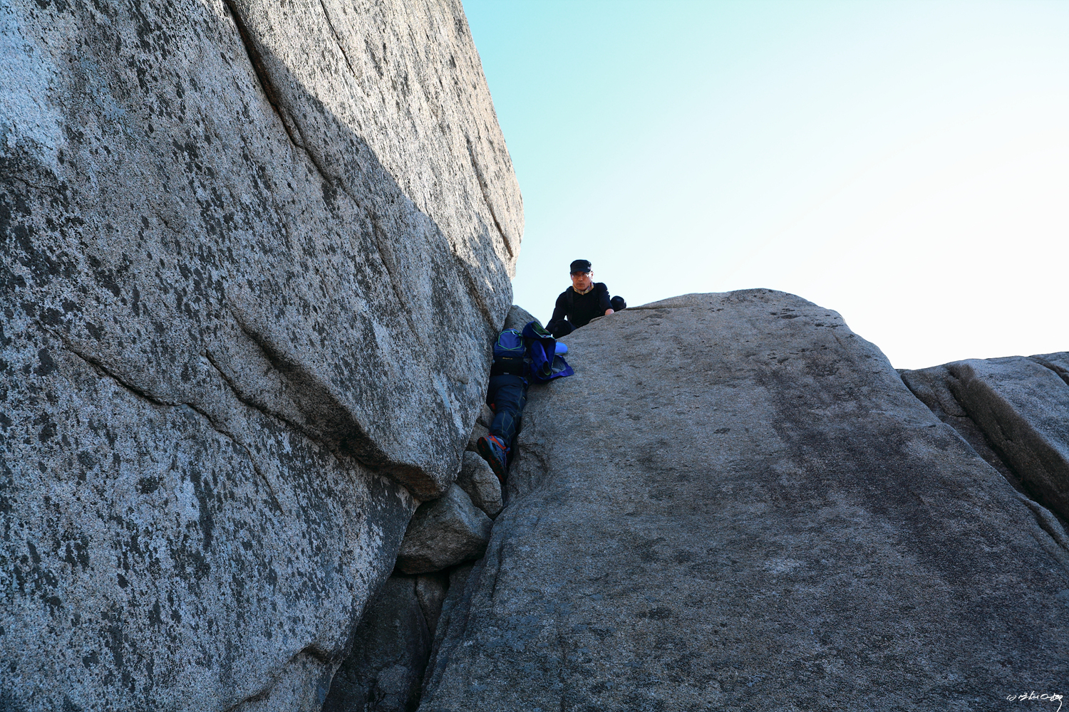 우린 장비가 없기에 왼쪽 직벽을 타고 내려선 다음 마치 낮은 포복흘 하듯