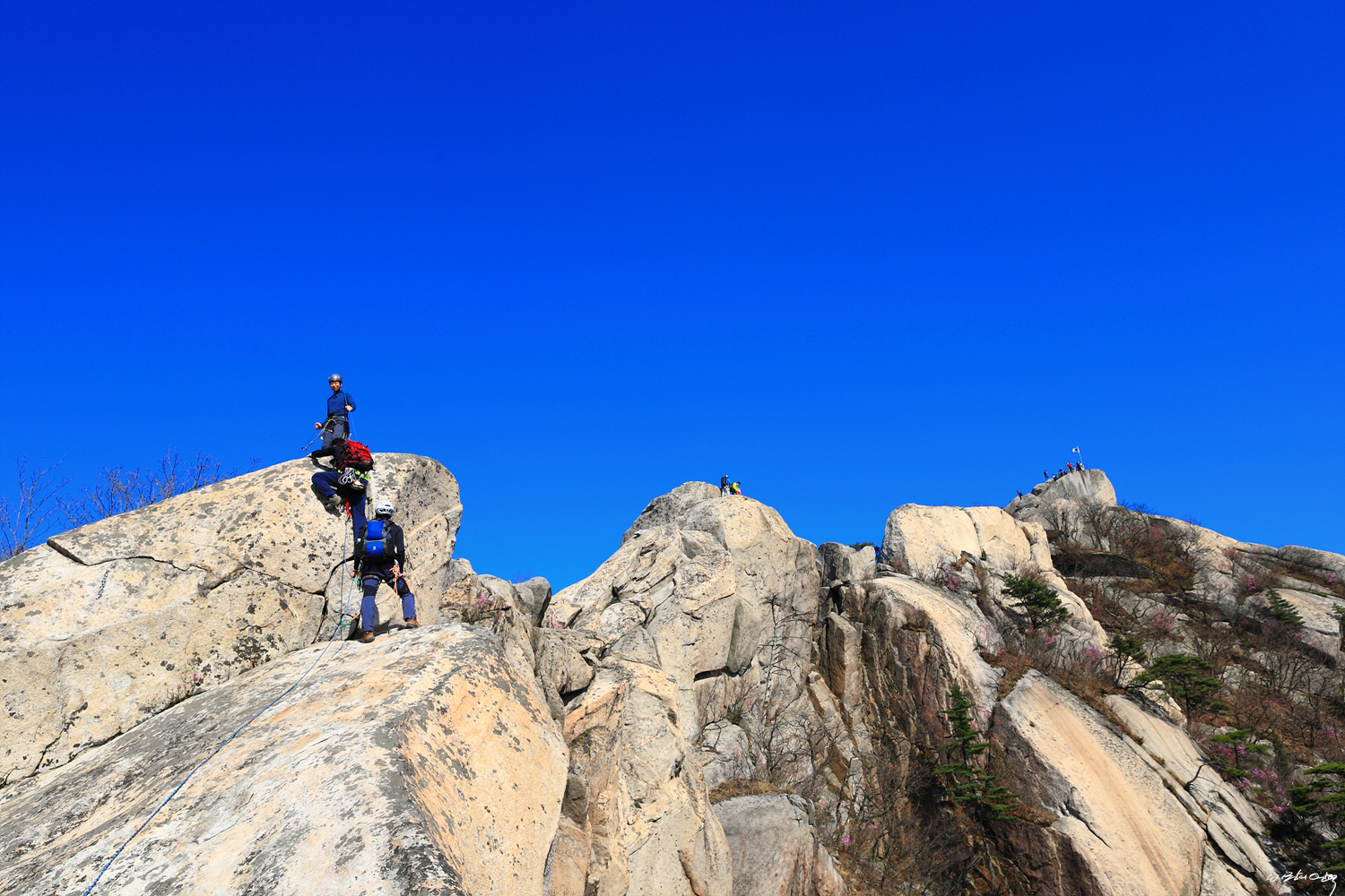 보이는 개구멍바위 정상에서 자일하강을 합니다.