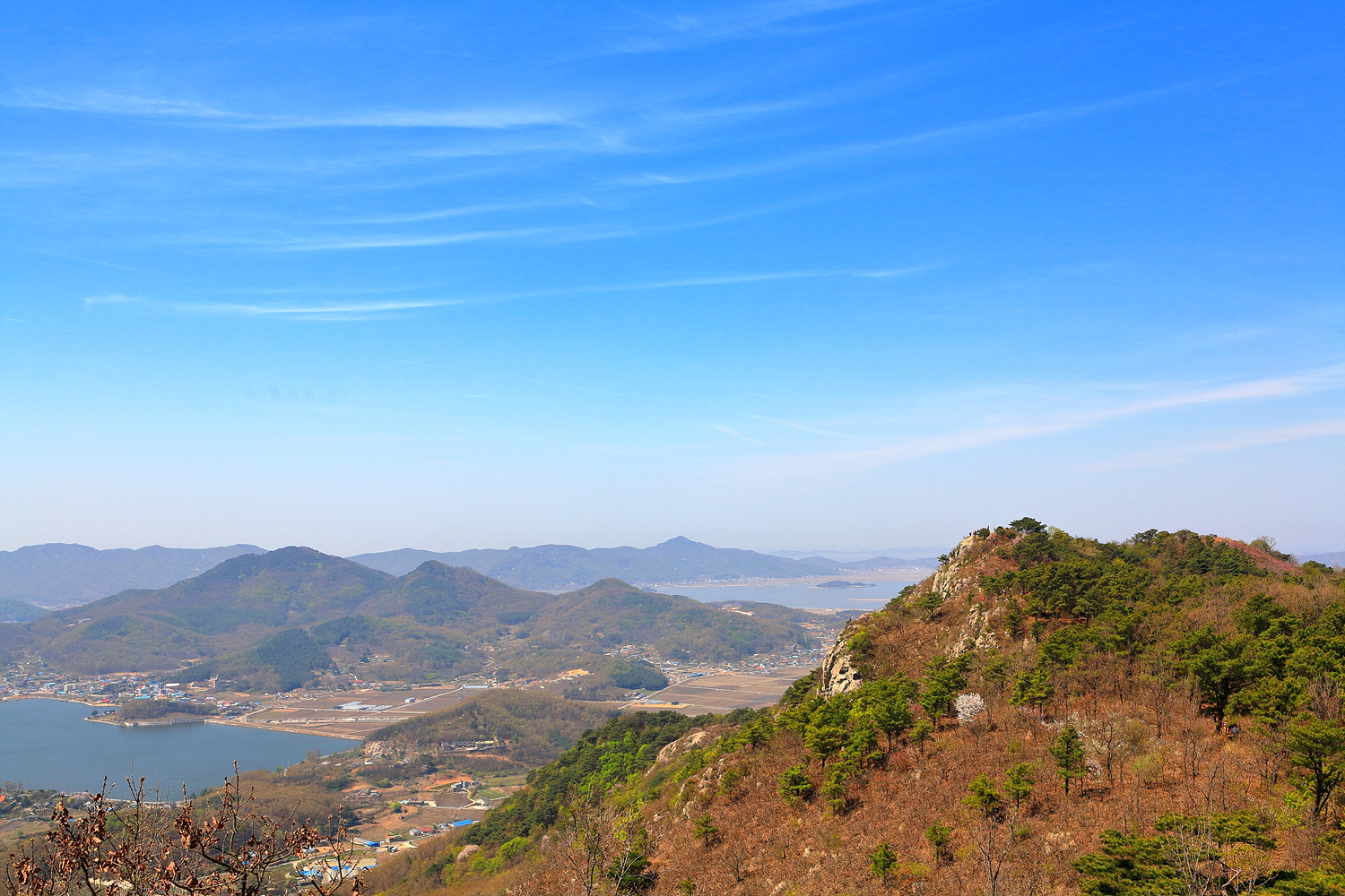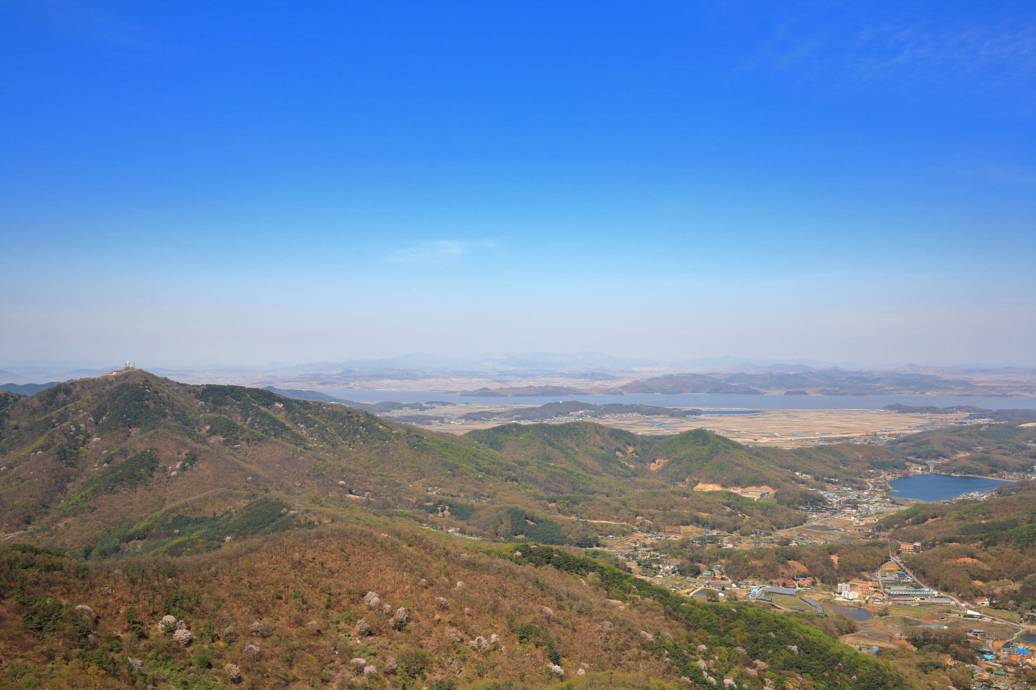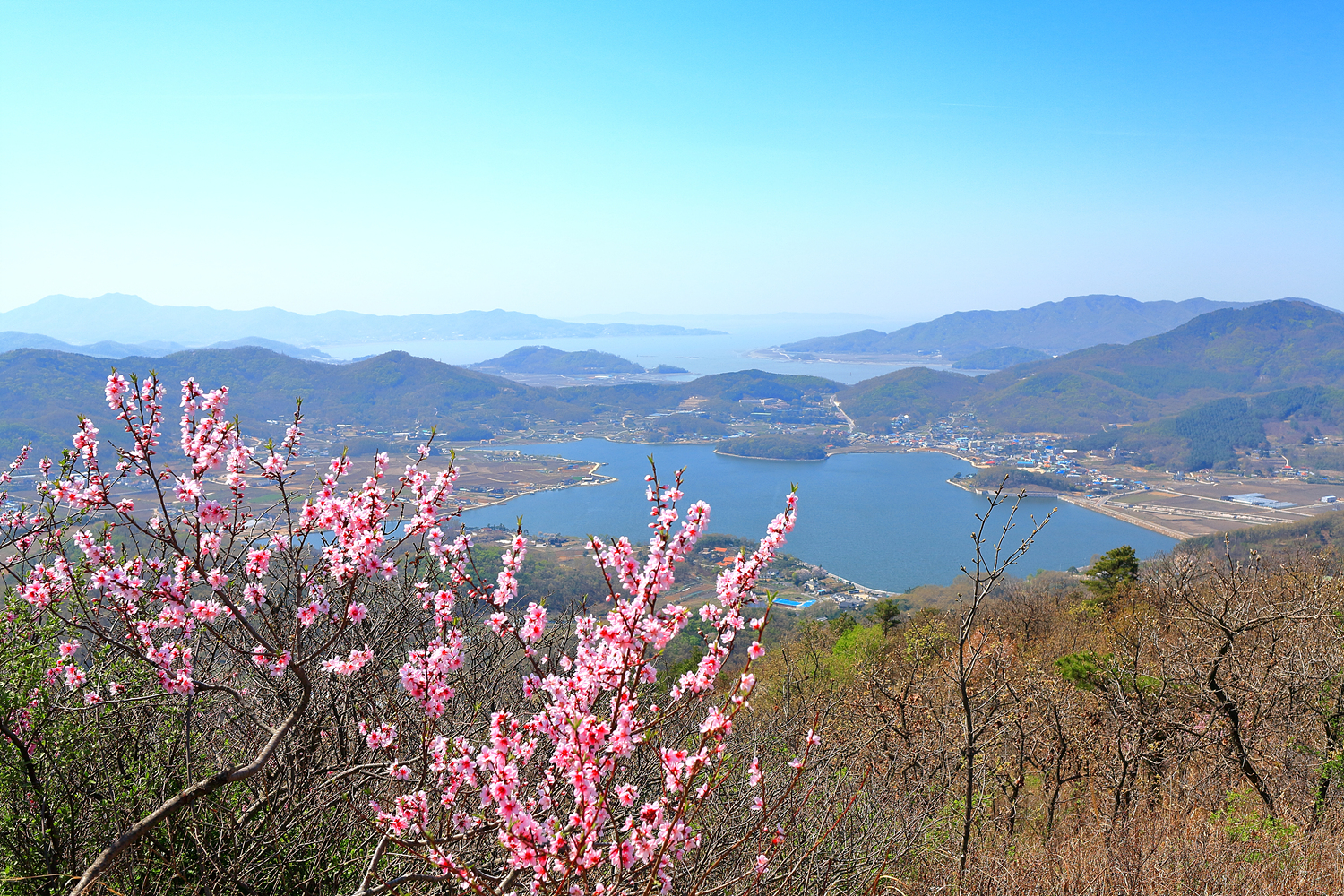 화사하게 핀 복사꽃 뒤로 고려저수지와 크고 작은 섬들을 조망해 보는데...