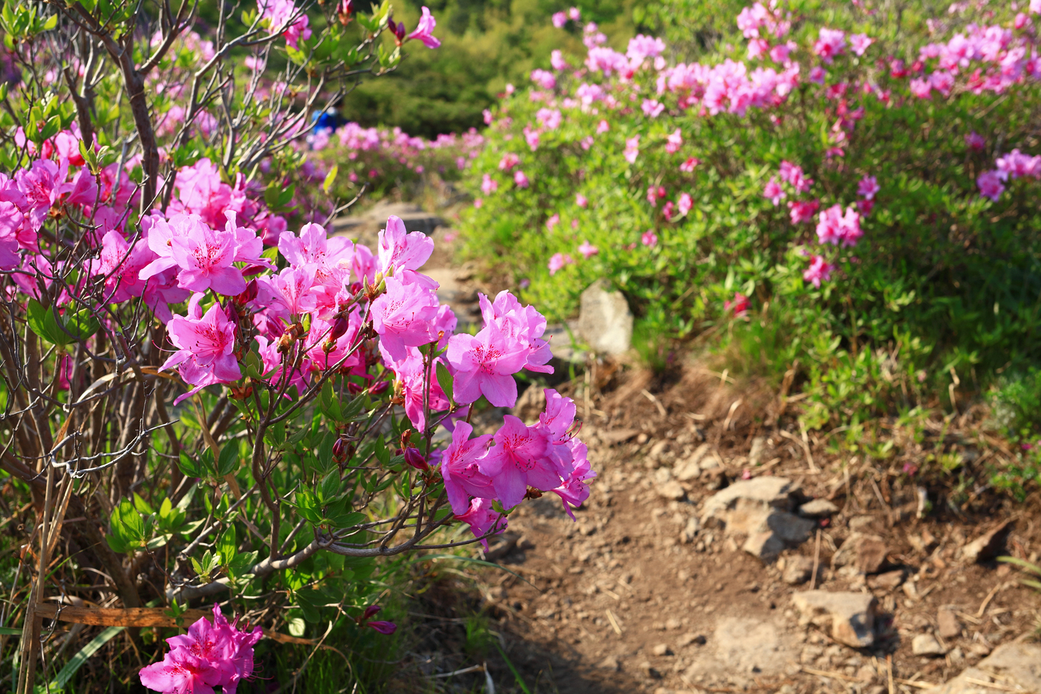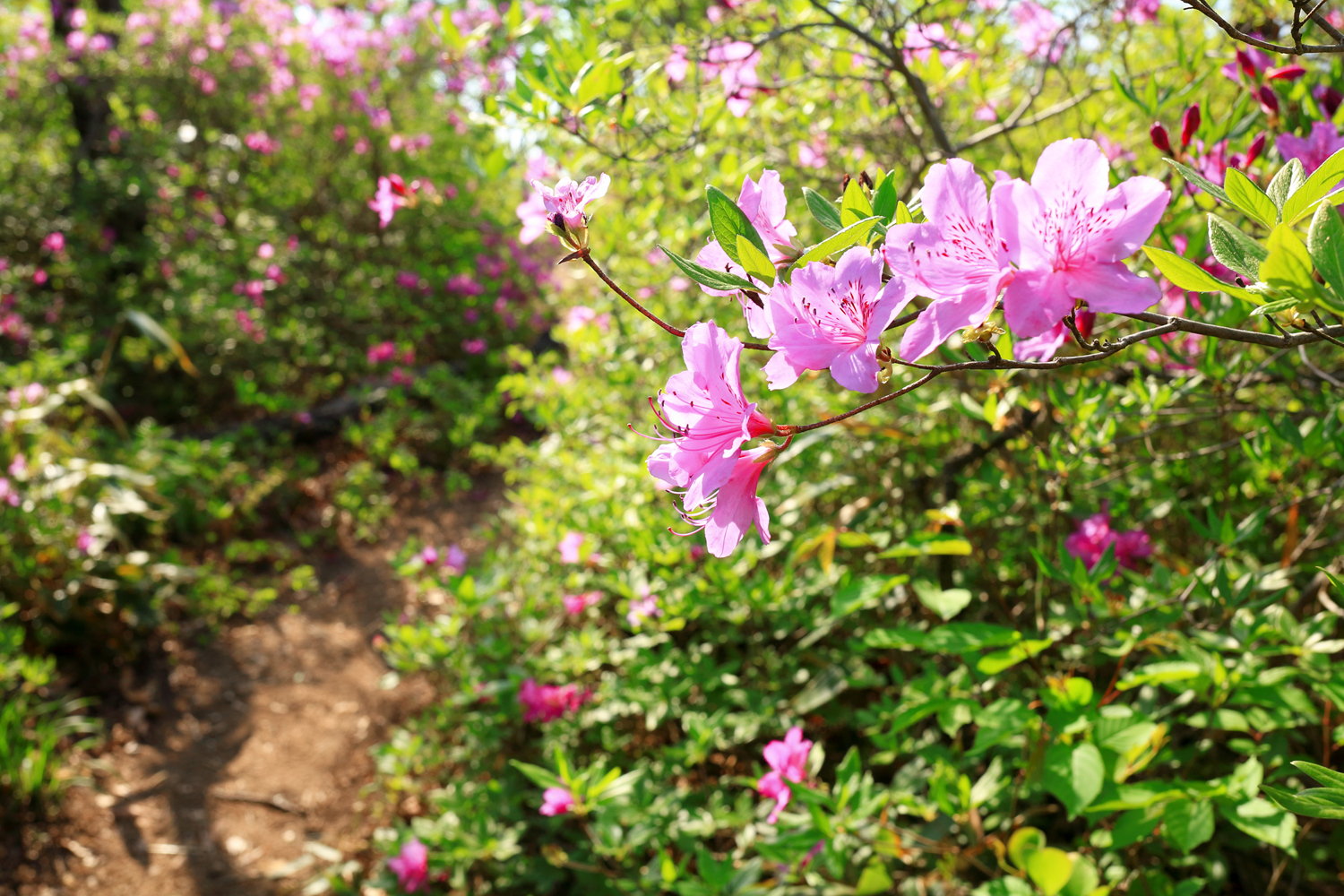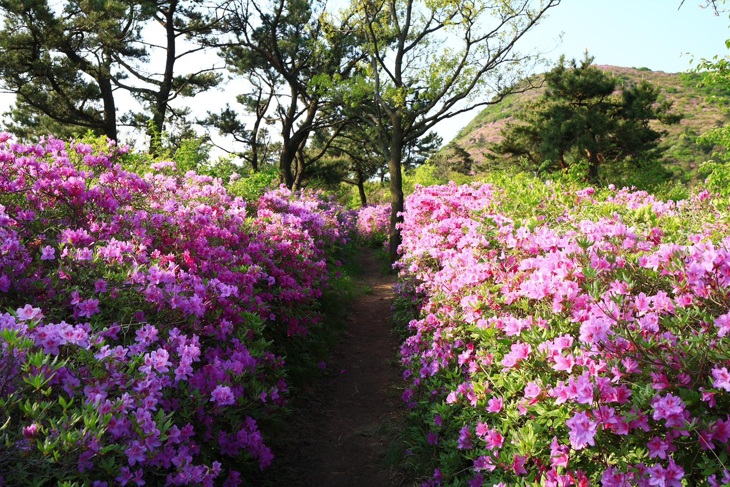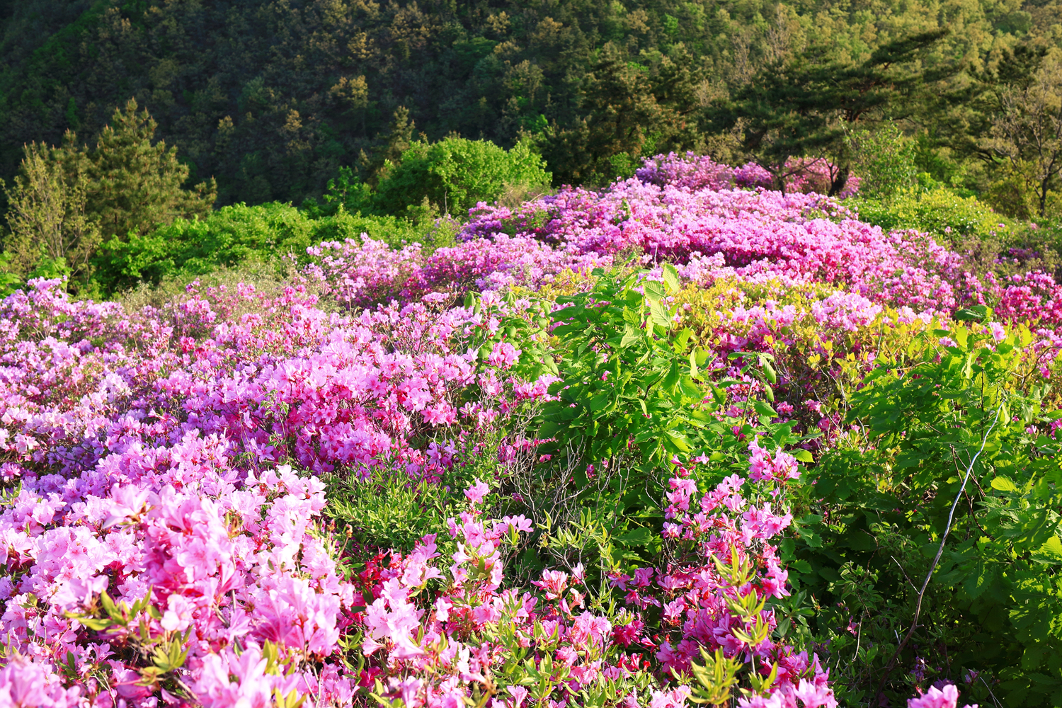 아침햇살 받으며 그 영롱했던 핑크빛 철쭉꽃길을