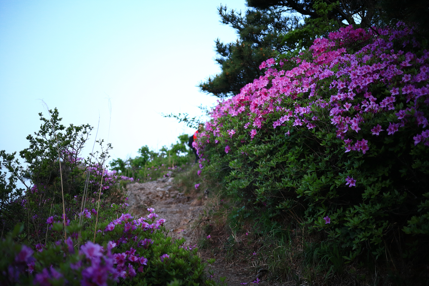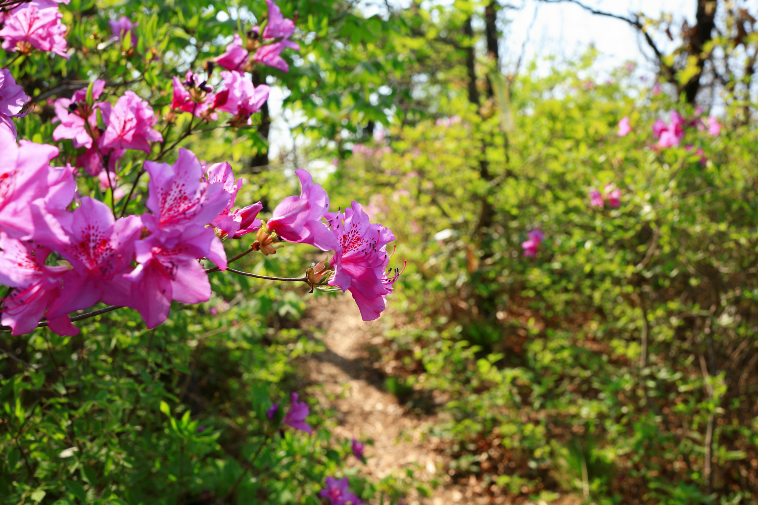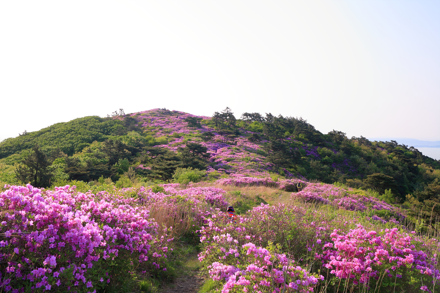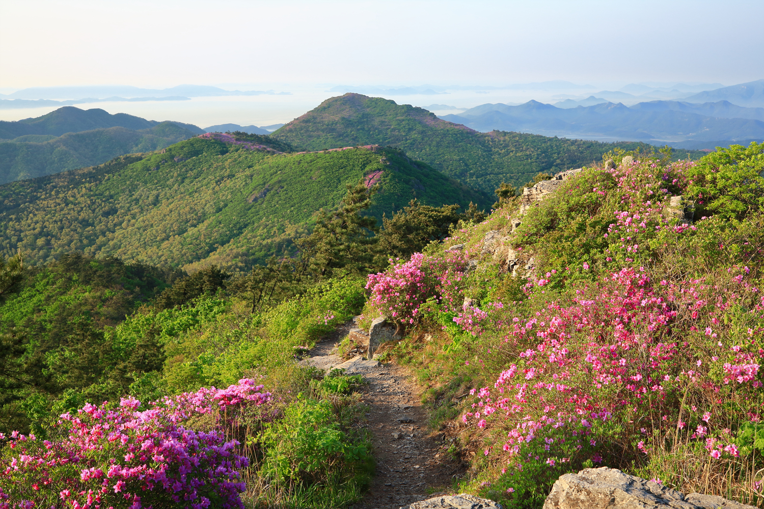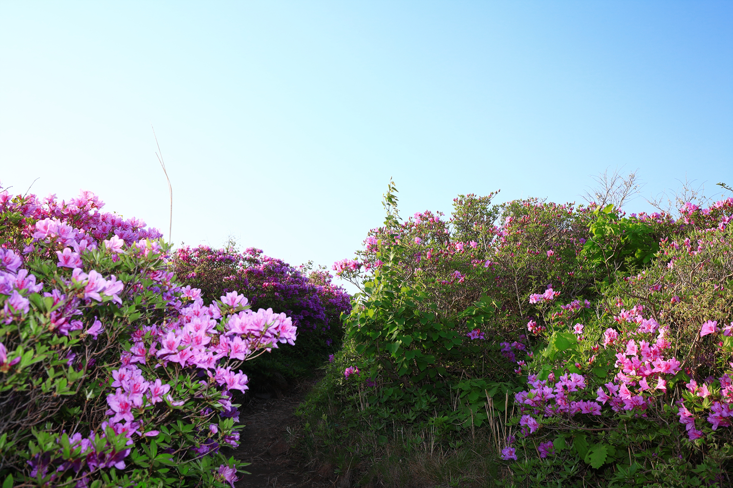 아침햇살 받으며 그 영롱했던 핑크빛 철쭉꽃길을