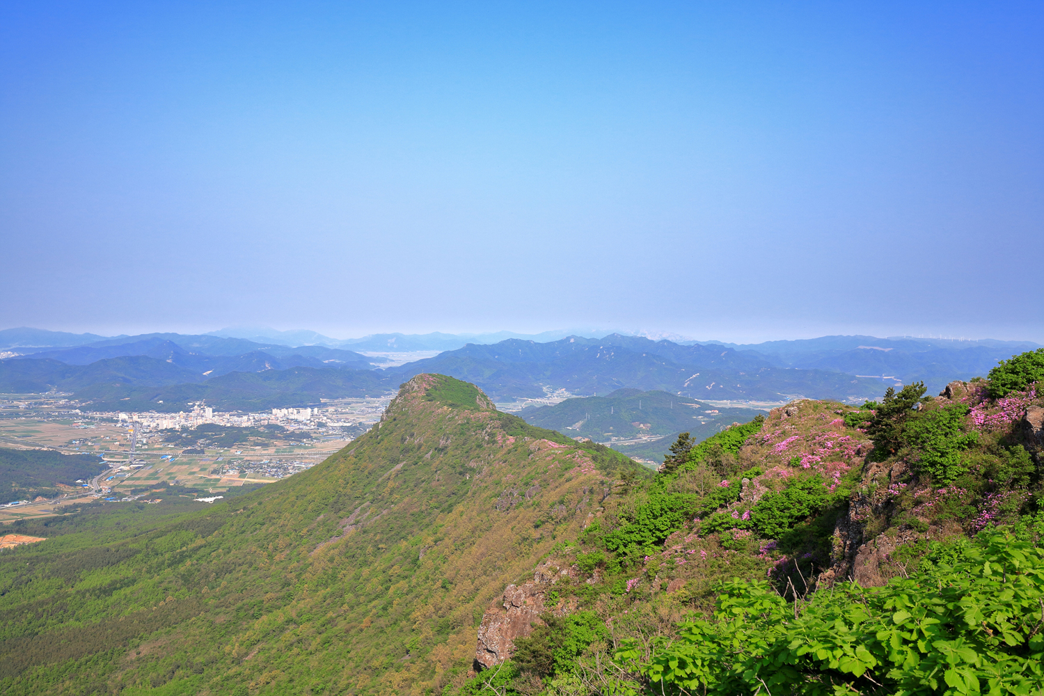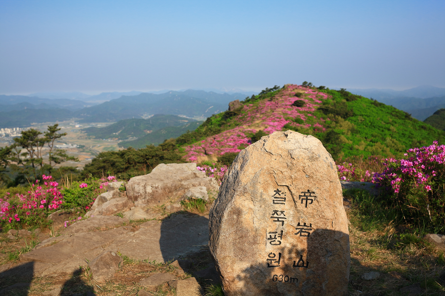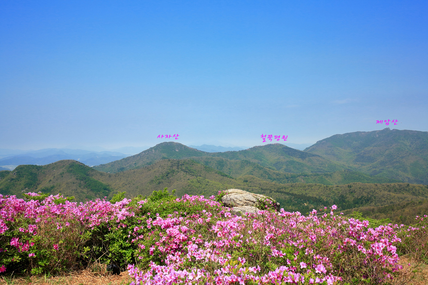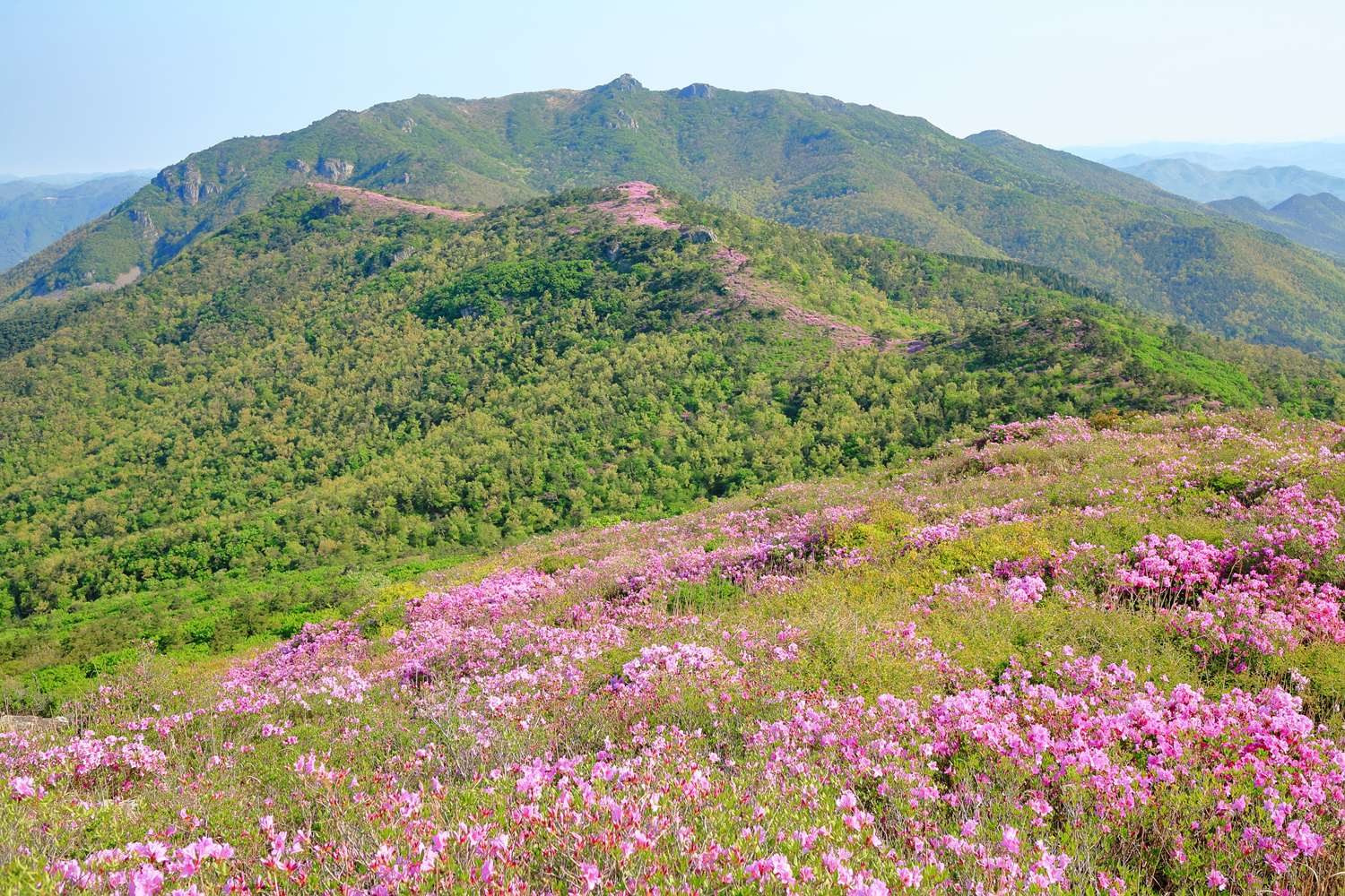 제암산을 뒤로 아침햇살 받으며 천상의 철쭉길따라