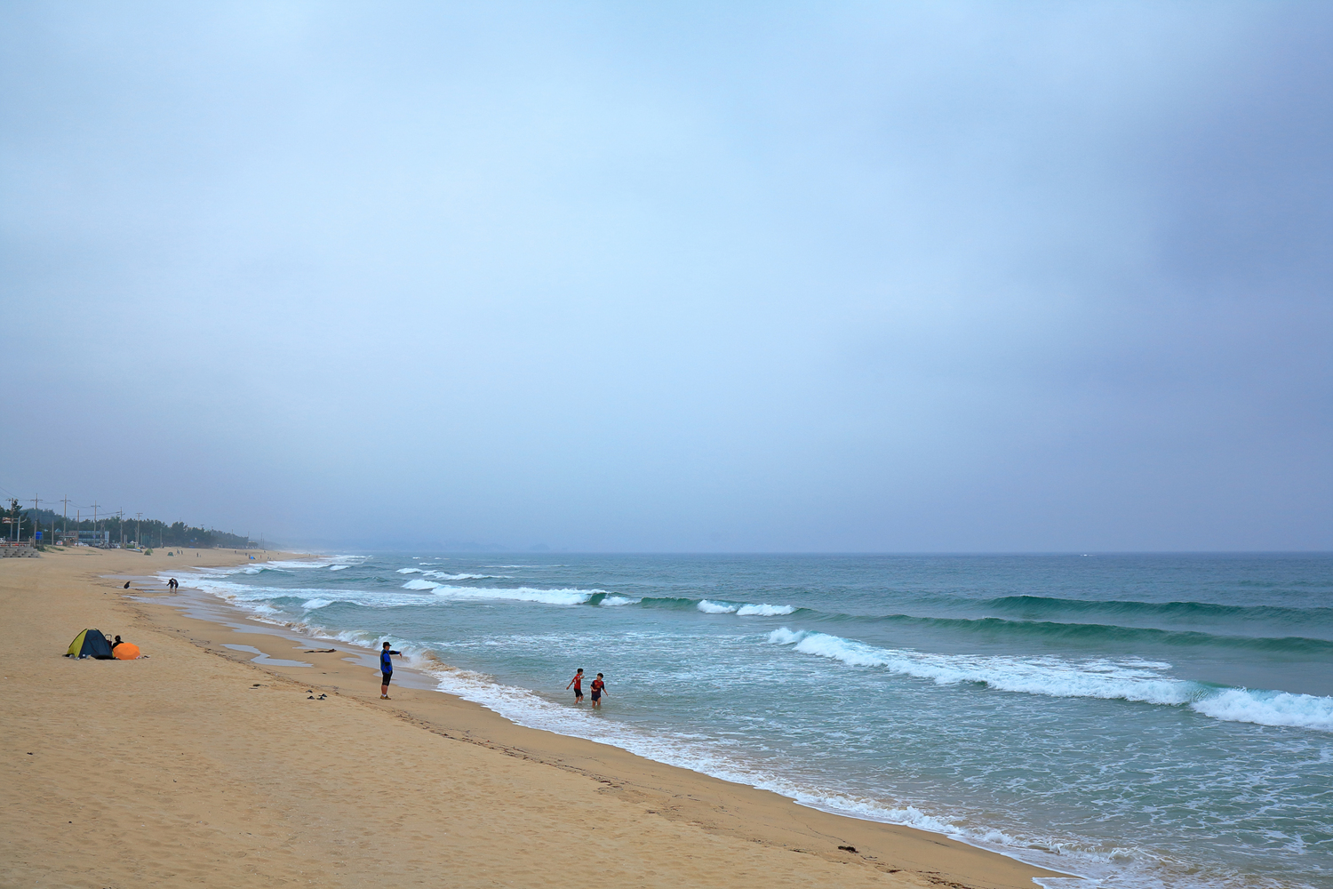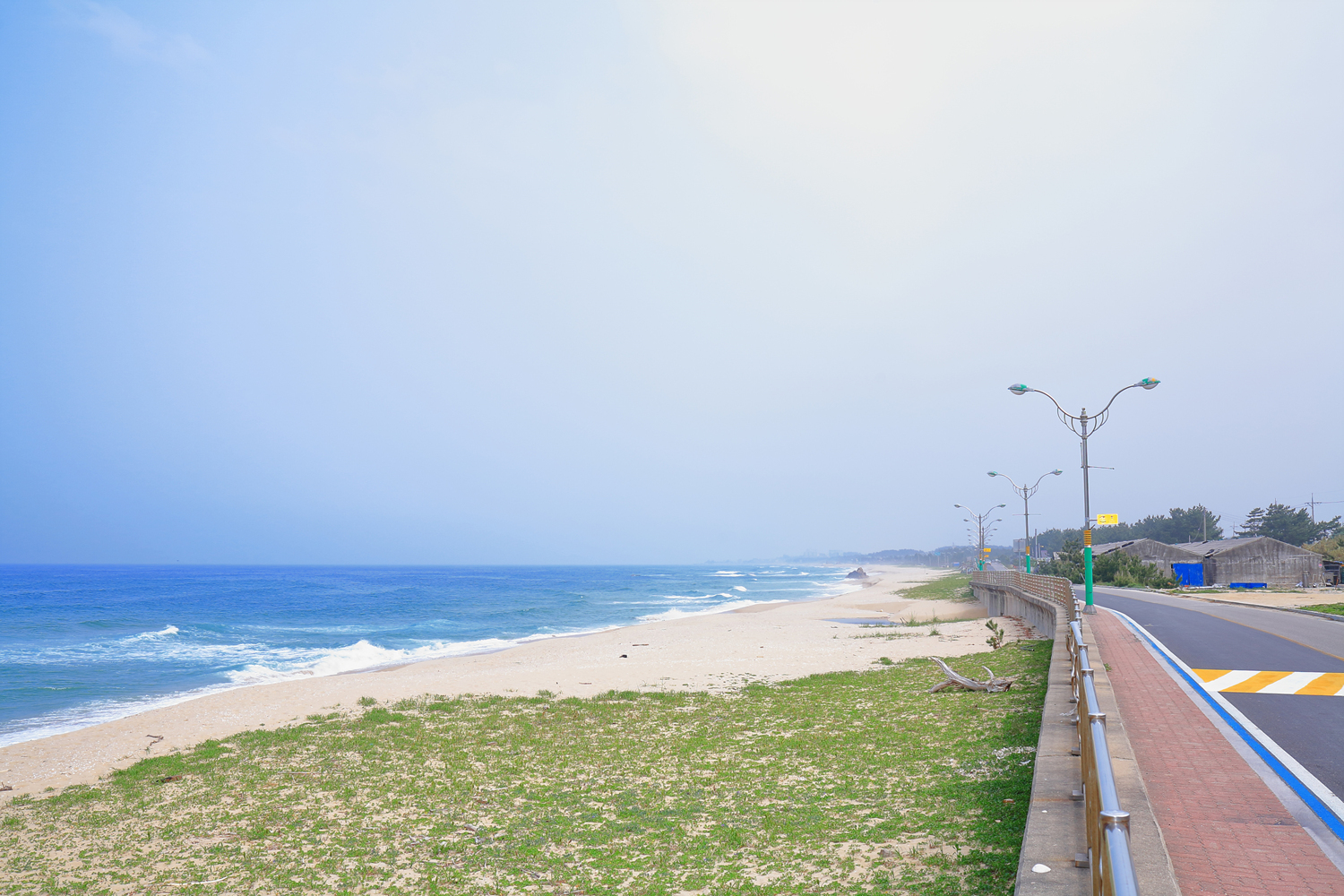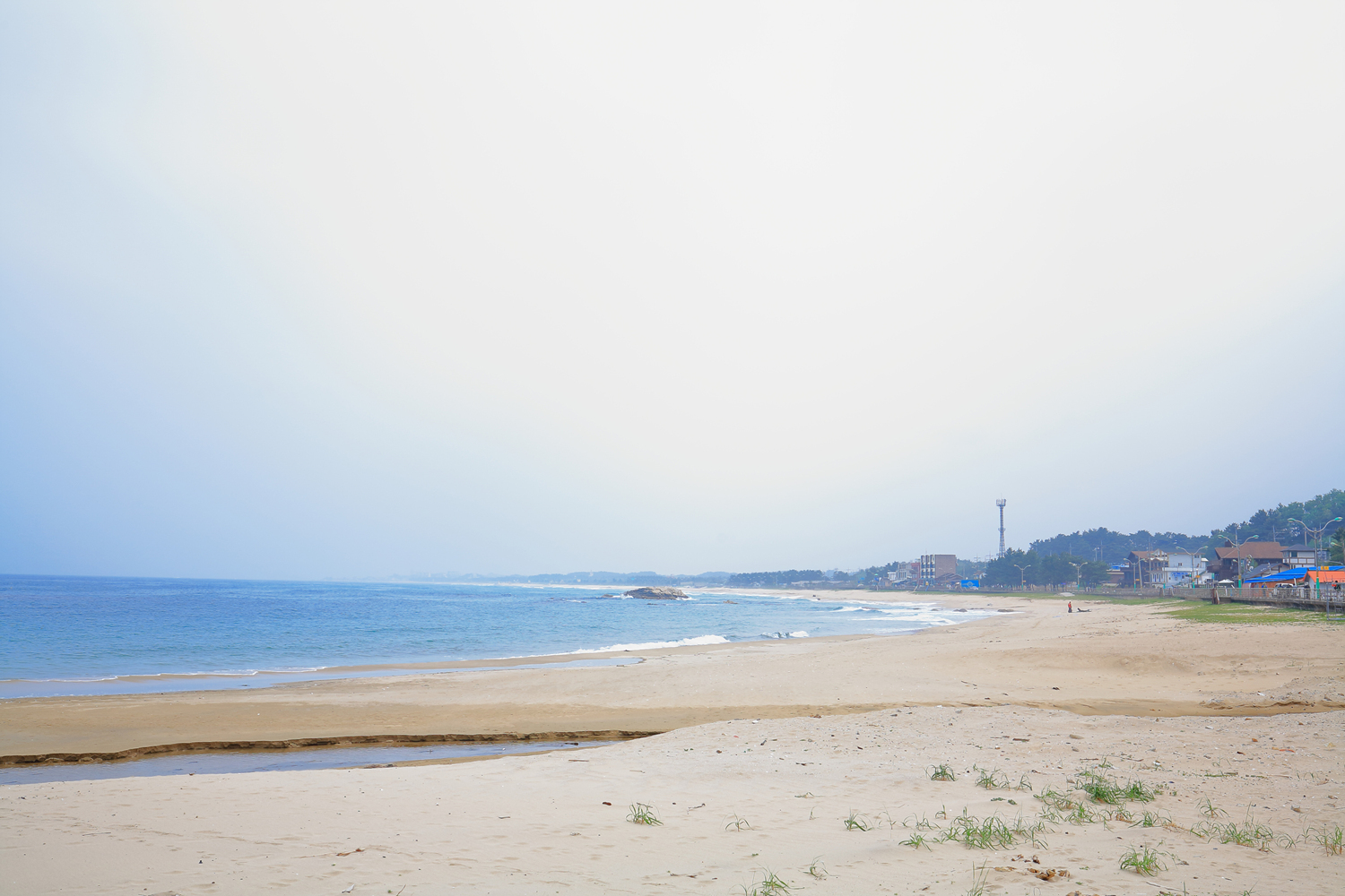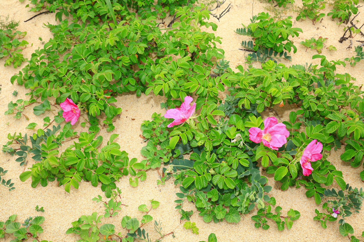 끝없이 펼쳐지는 모래사장과 밀려오는 파도 검붉은 해당화 꽃길따라