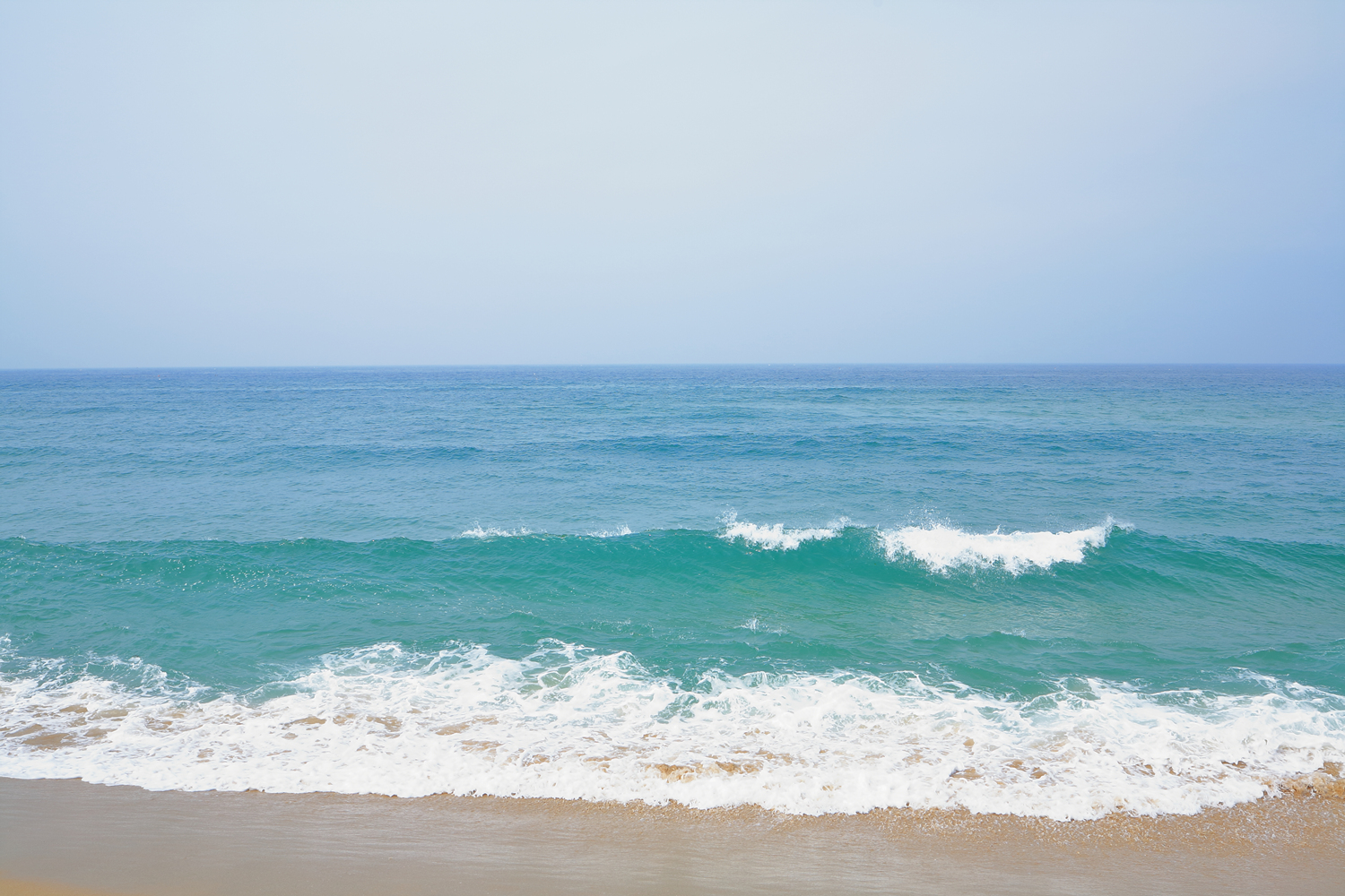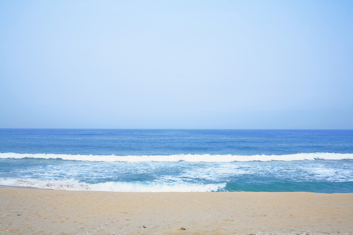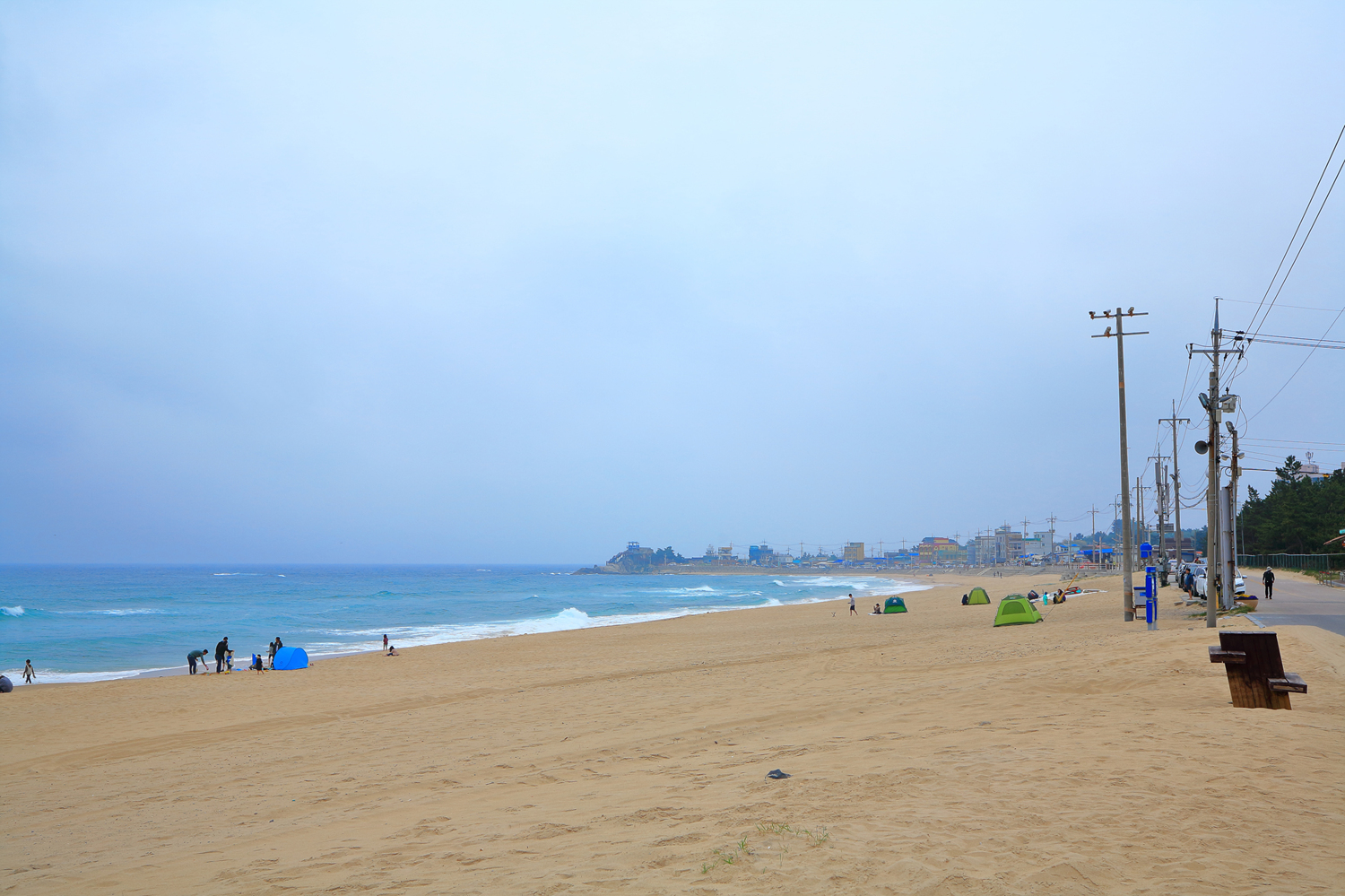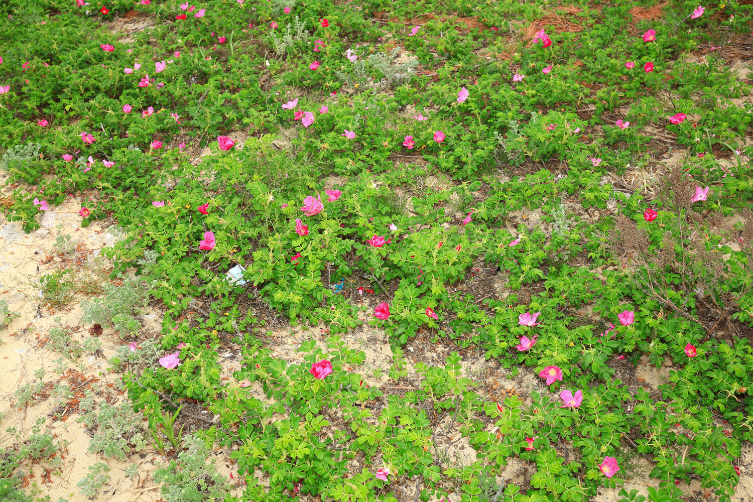 끝없이 펼쳐지는 모래사장과 밀려오는 파도 검붉은 해당화 꽃길따라
