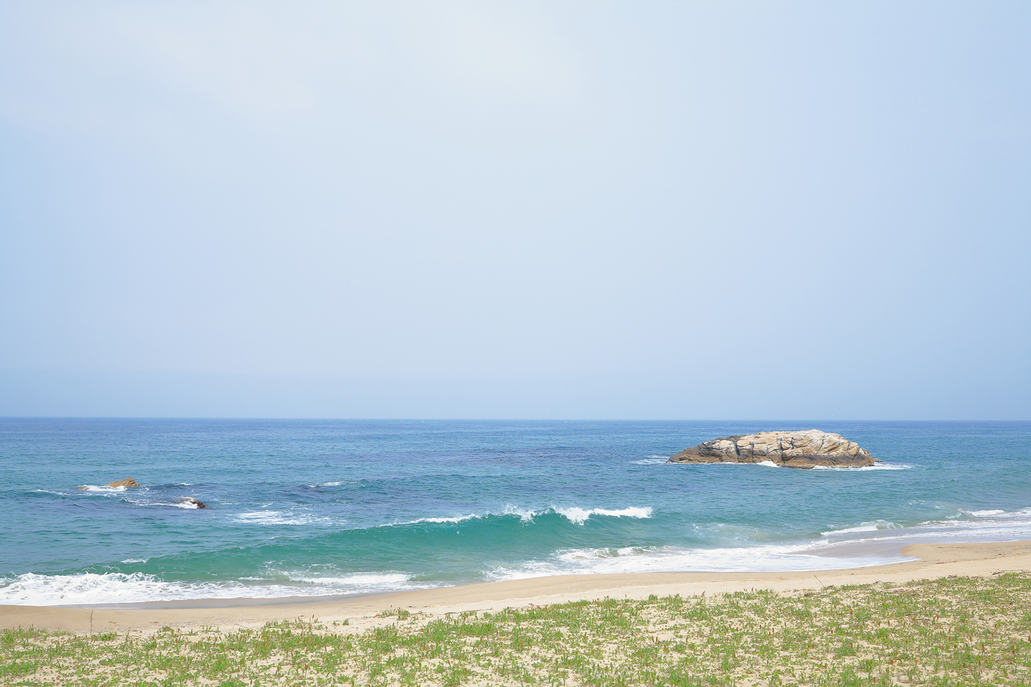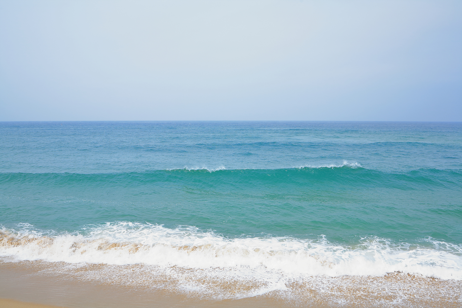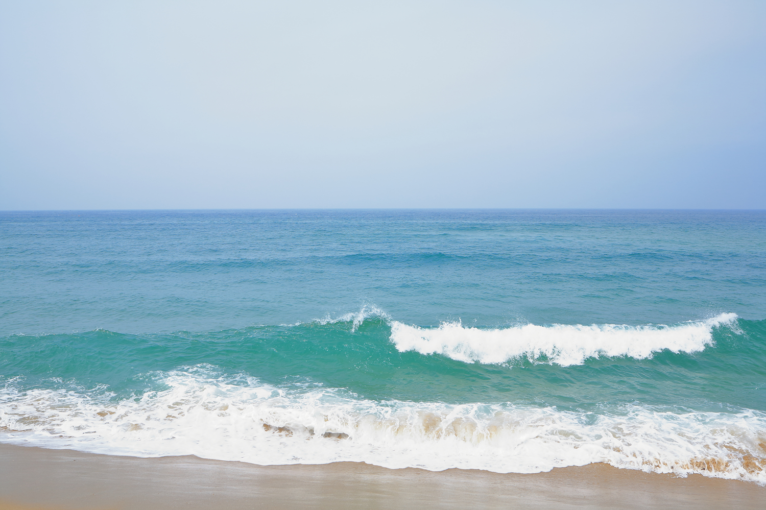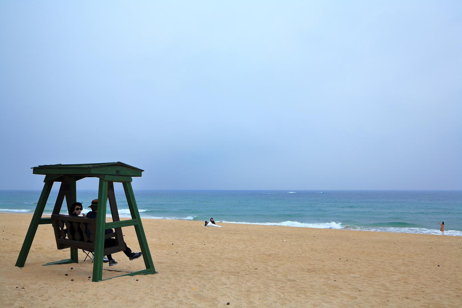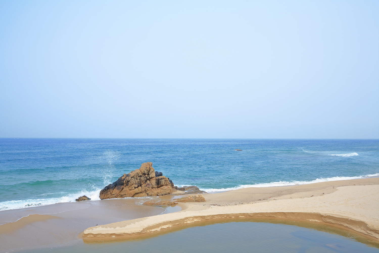끝없이 펼쳐지는 모래사장과 밀려오는 파도 검붉은 해당화 꽃길따라