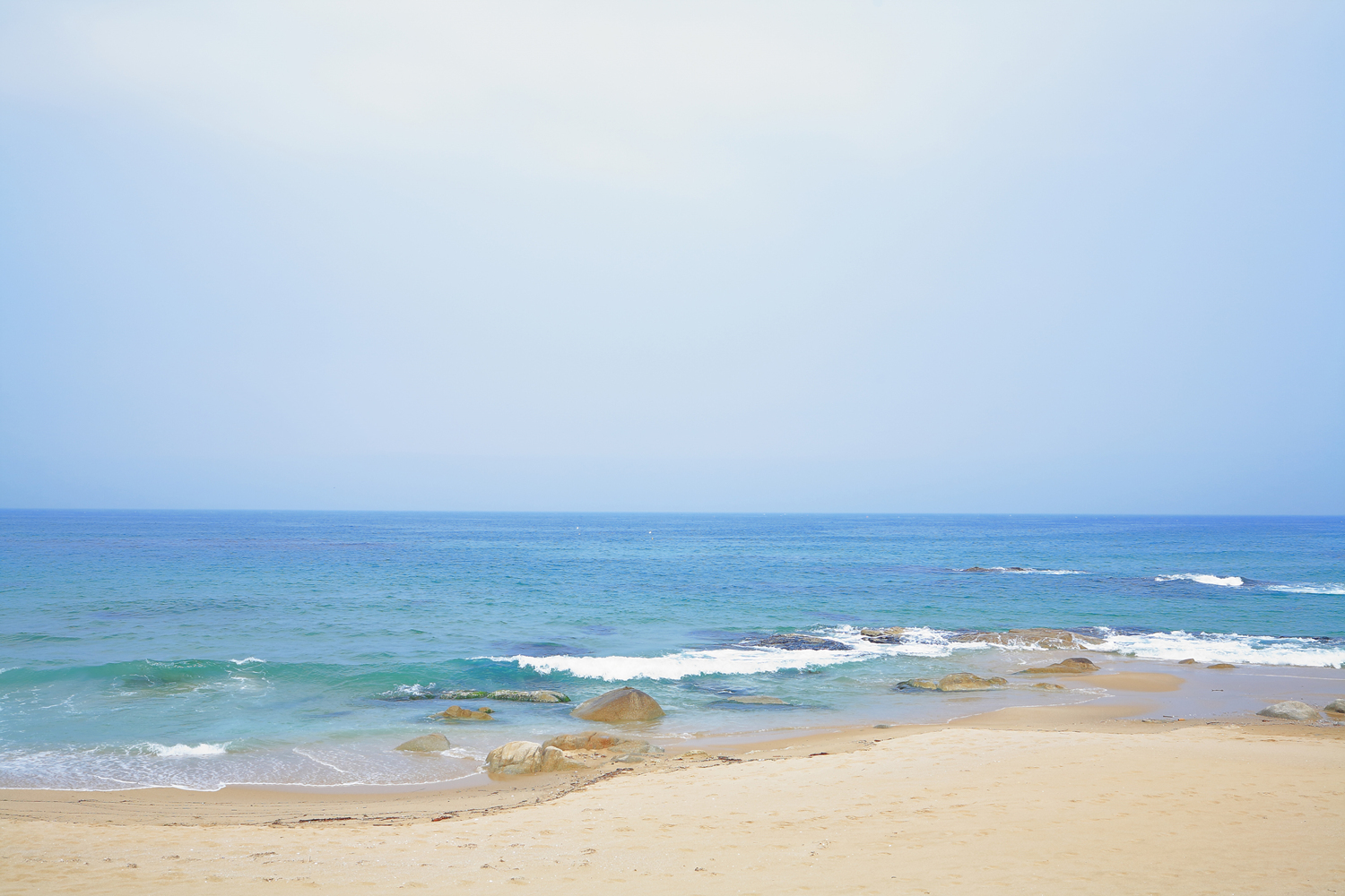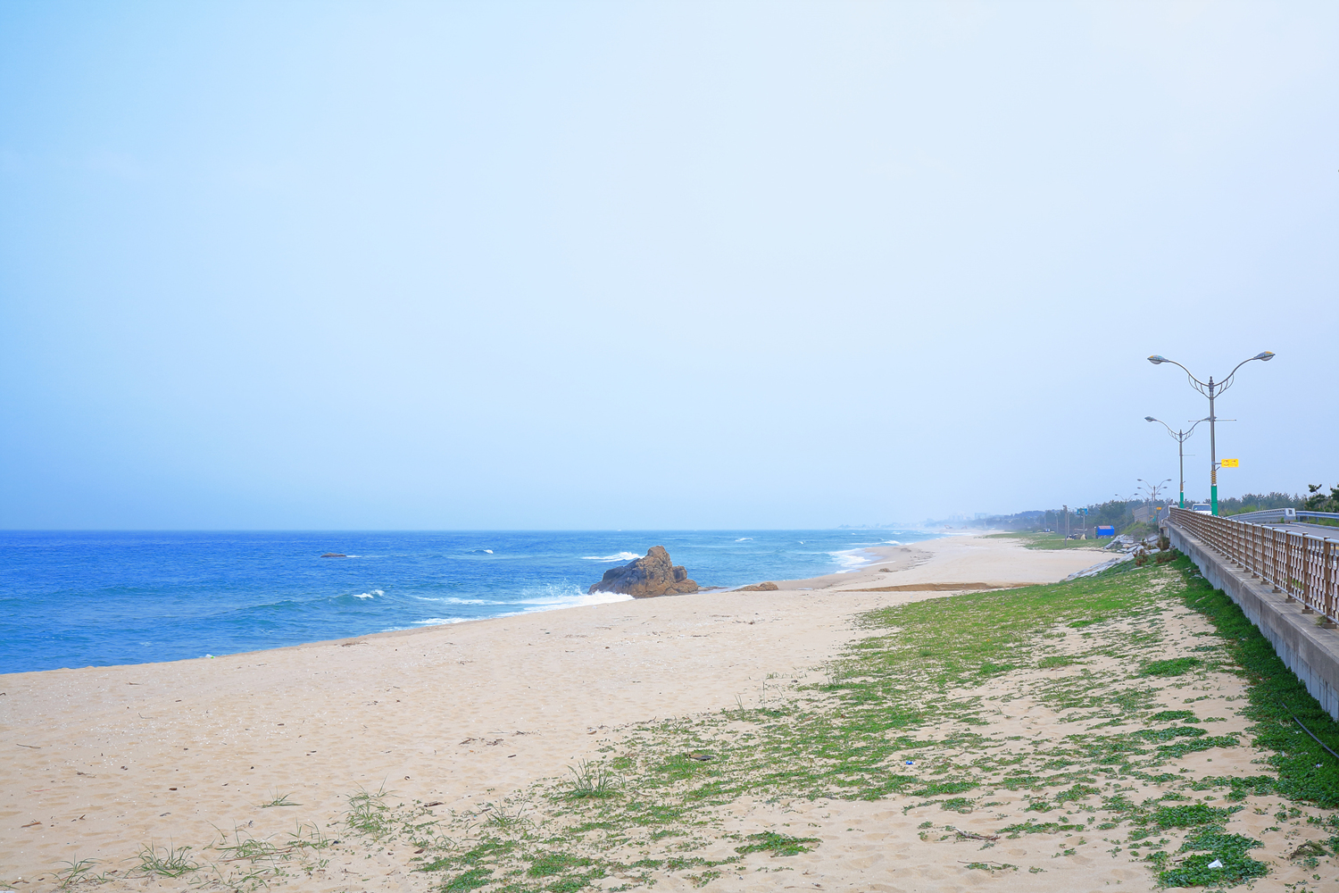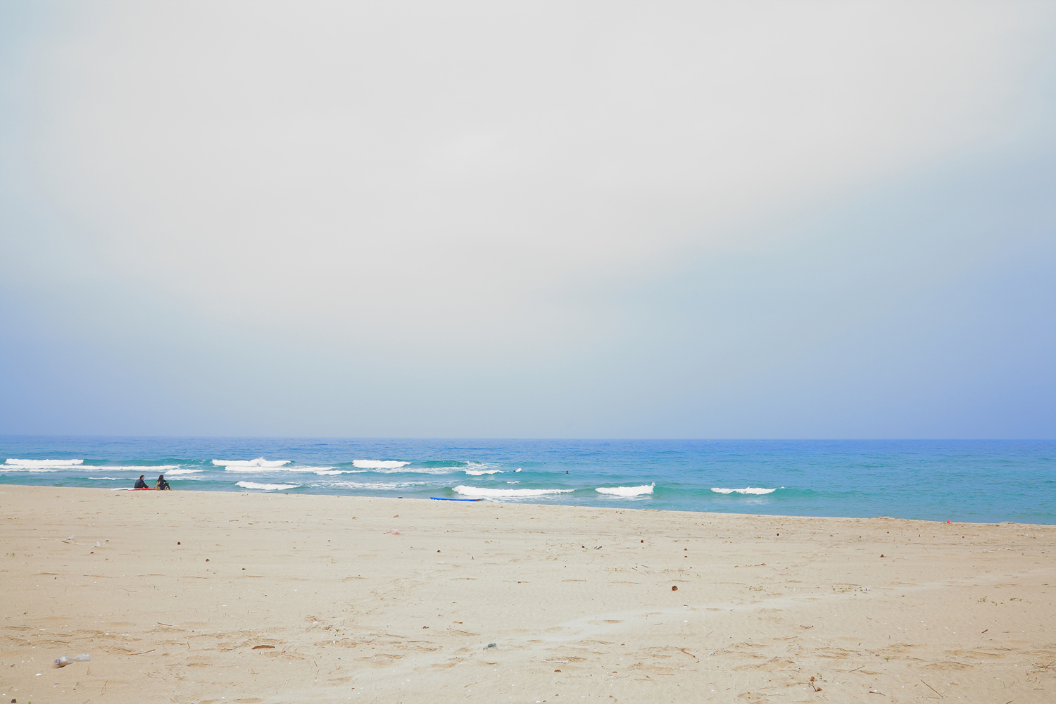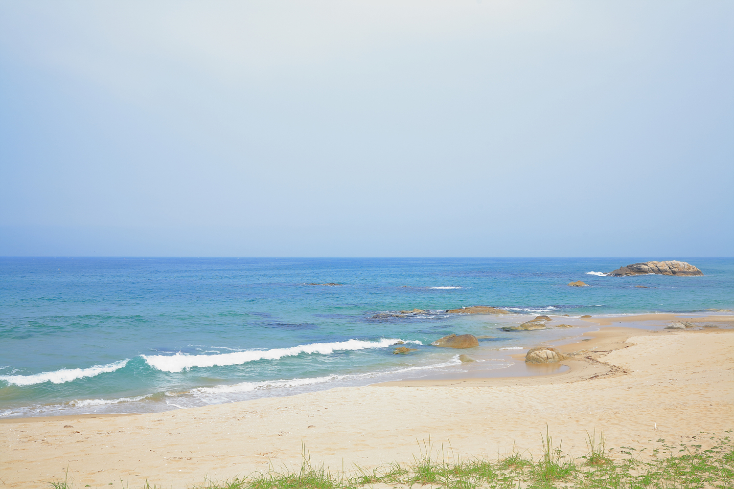 끝없이 펼쳐지는 모래사장과 밀려오는 파도 검붉은 해당화 꽃길따라