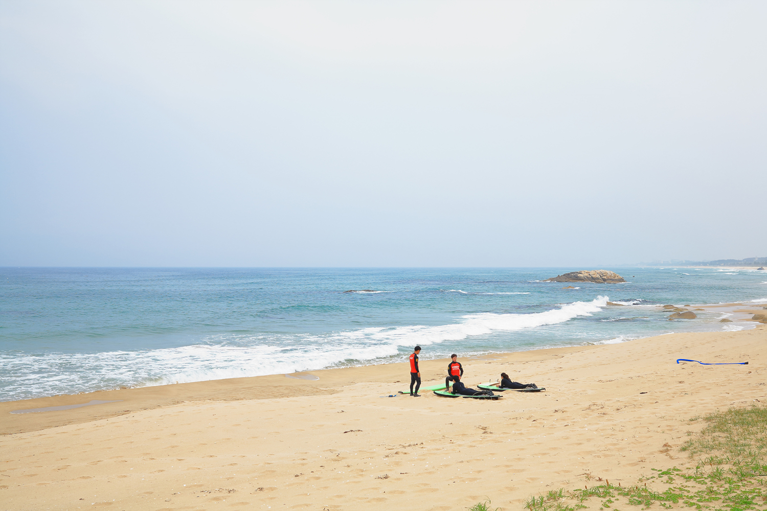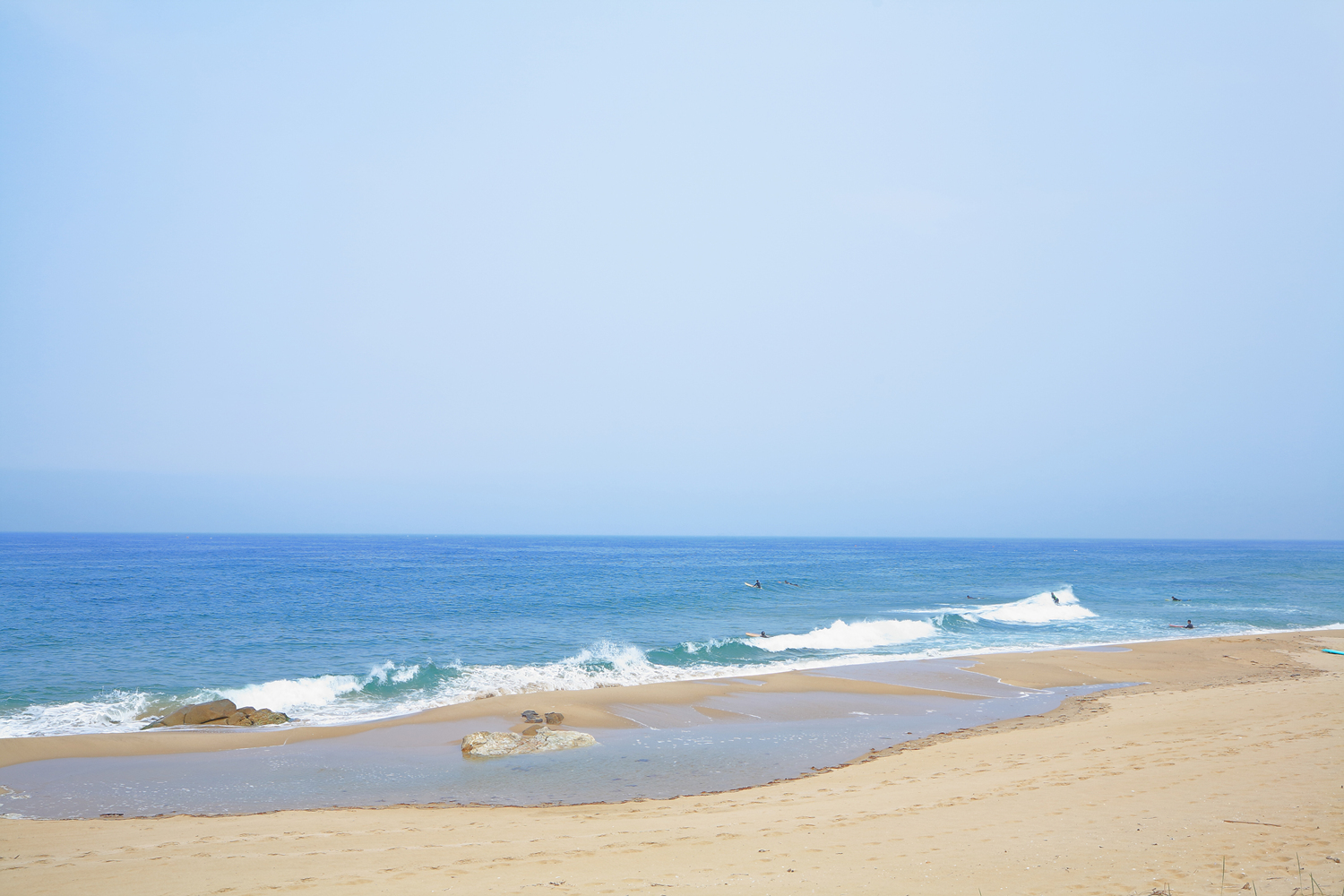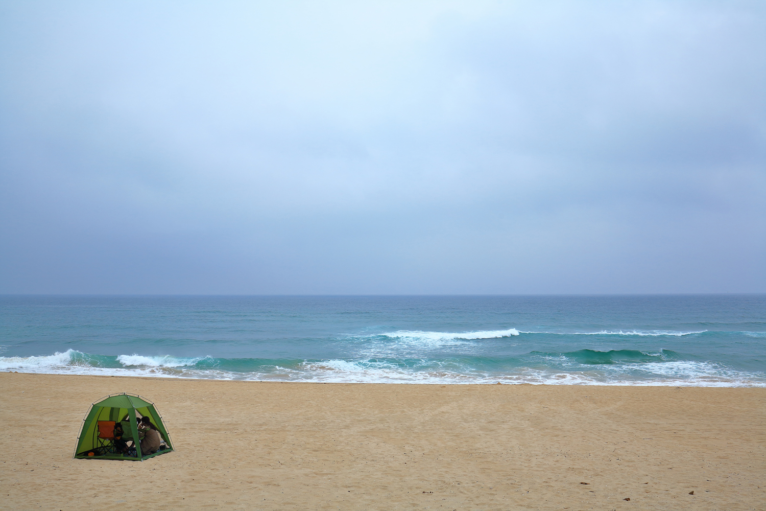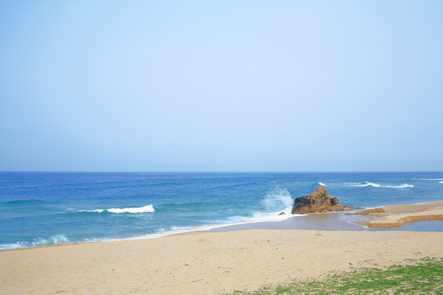 끝없이 펼쳐지는 모래사장과 밀려오는 파도 검붉은 해당화 꽃길따라