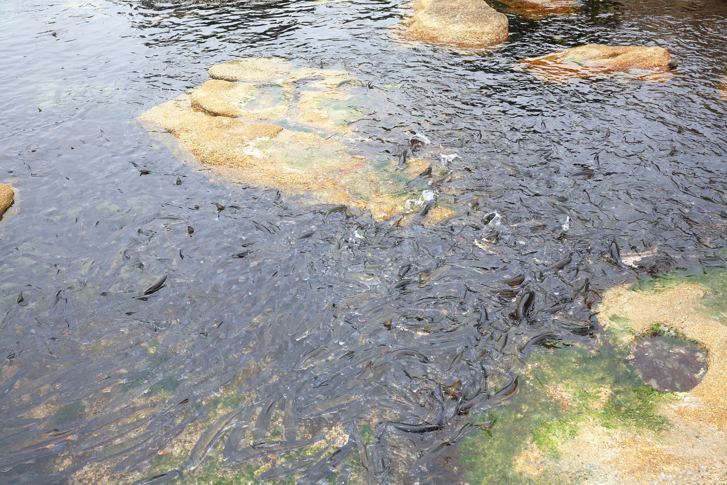 방생한 황어떼에 먹이를 뿌려주니 장관을 연출합니다.