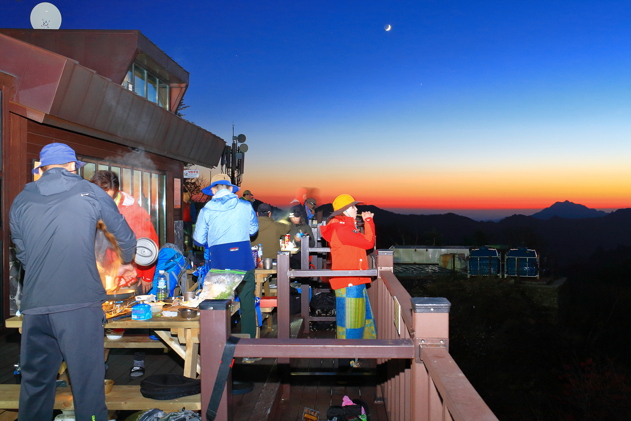 소청대피소 위로 초승달이 멋진 석양빛과 함께