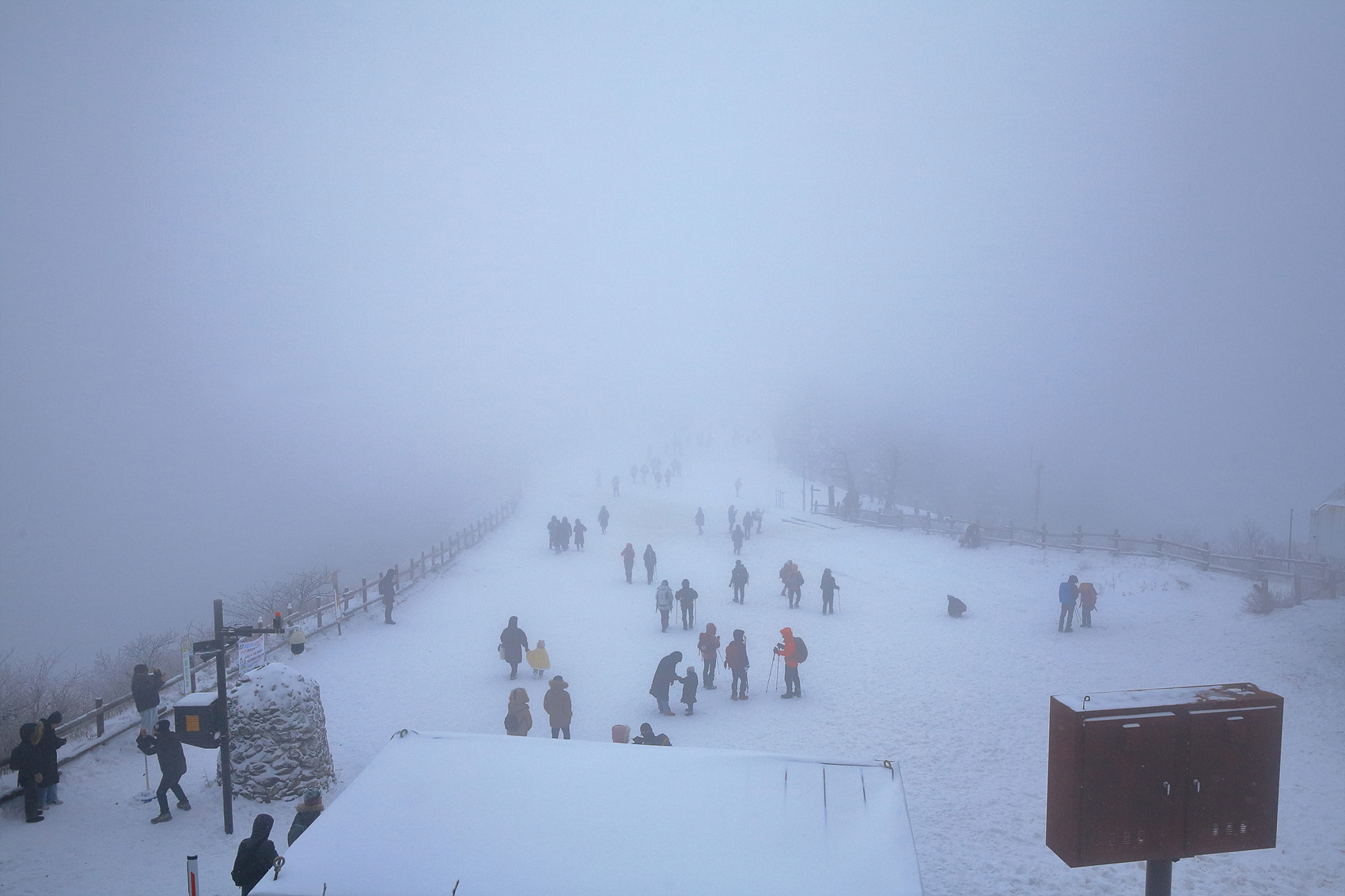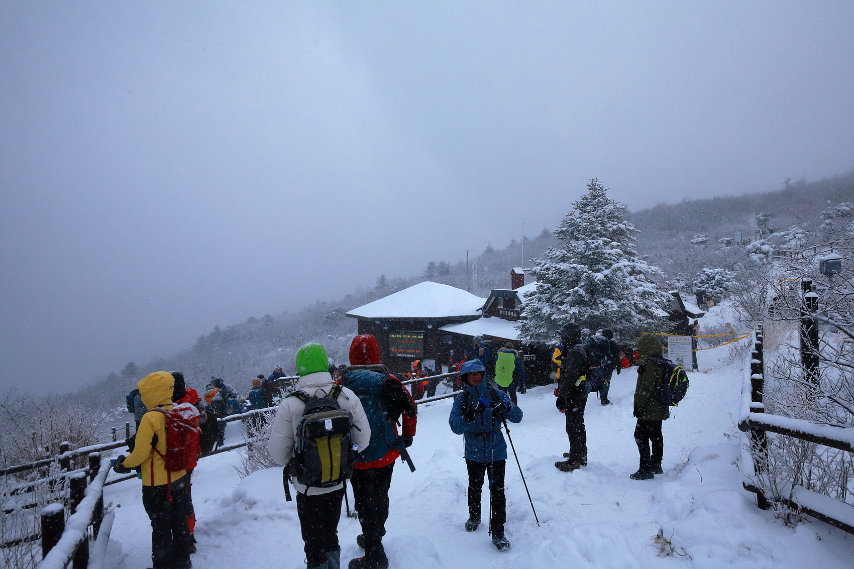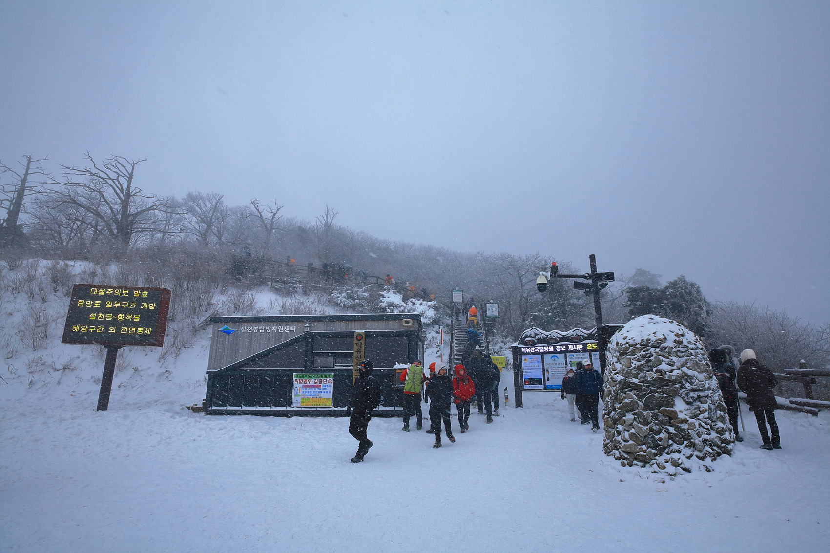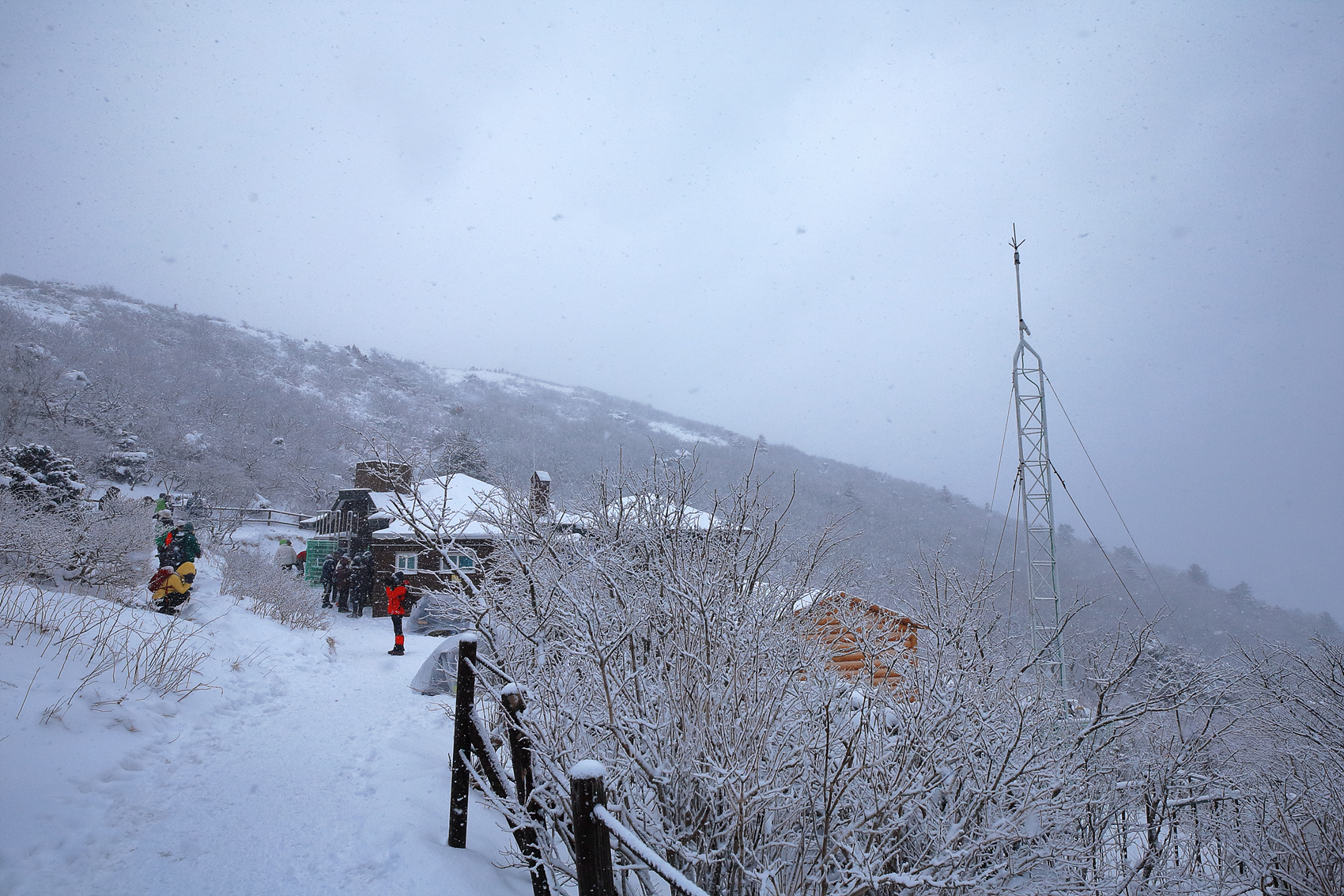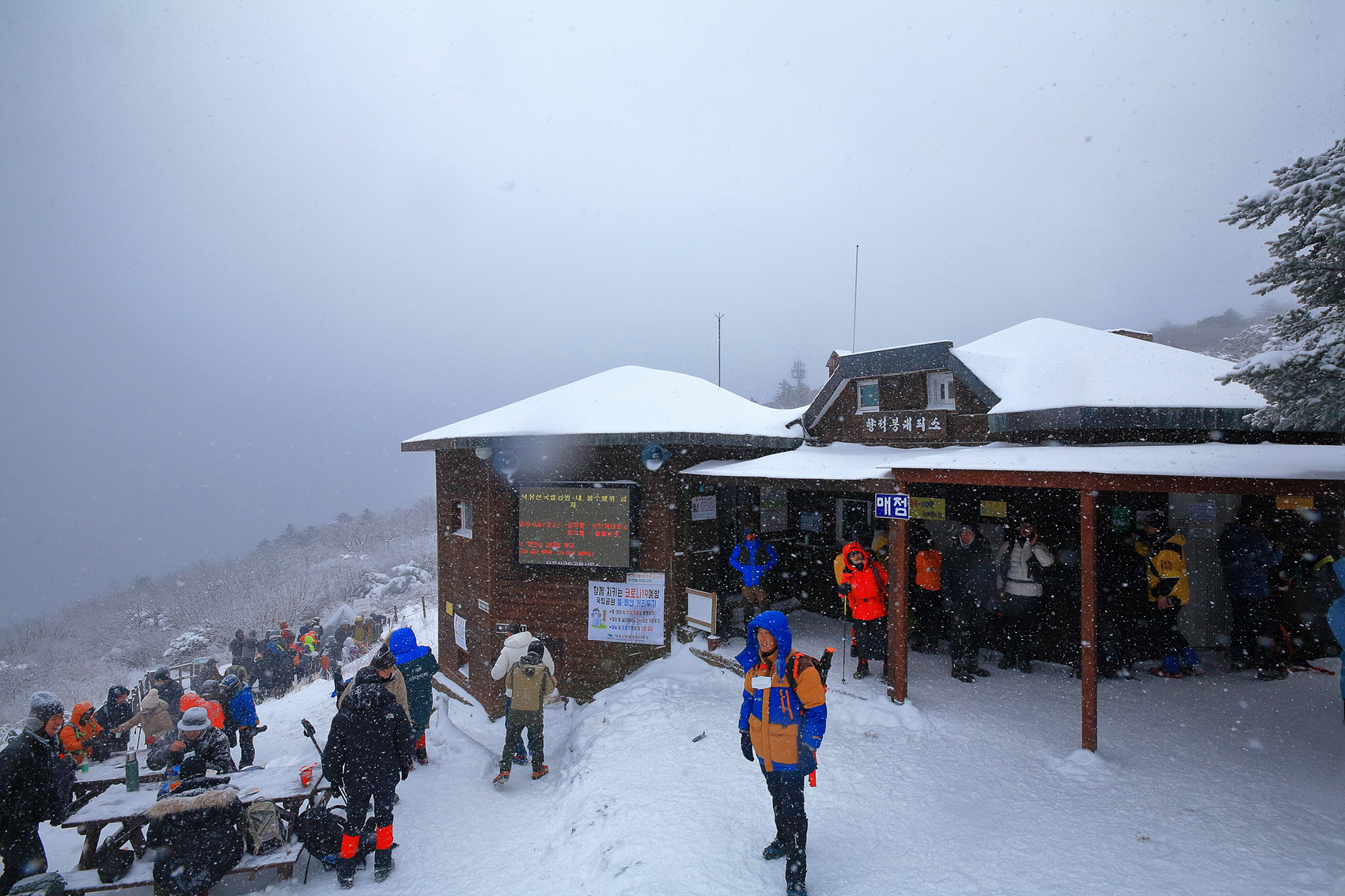 칼바람에 눈 맞으며 대피소 처마밑에서