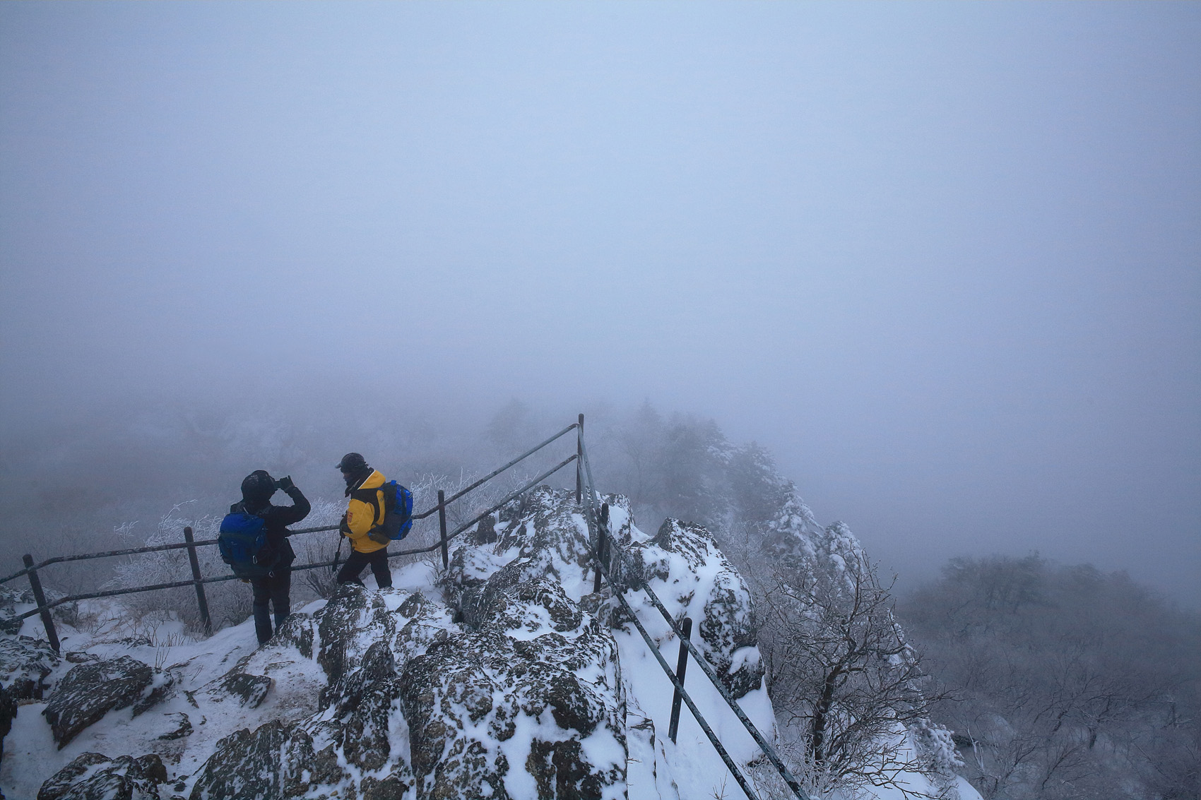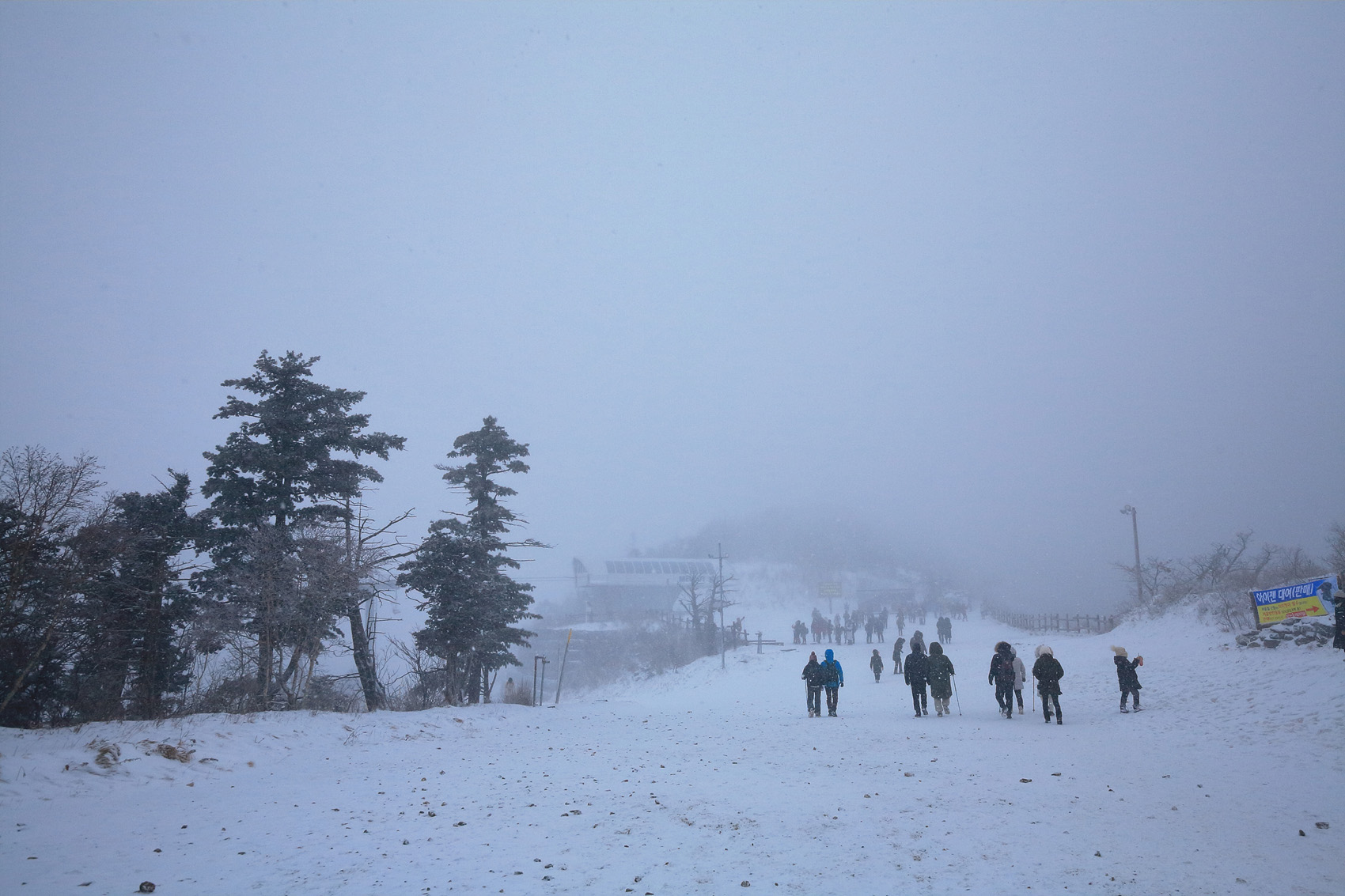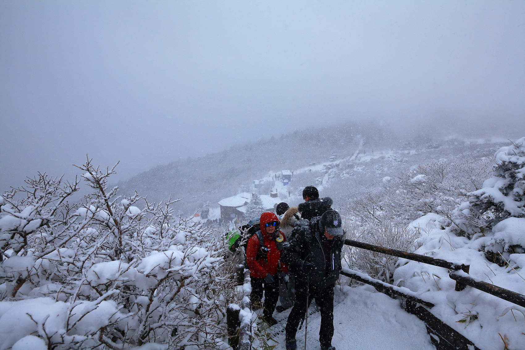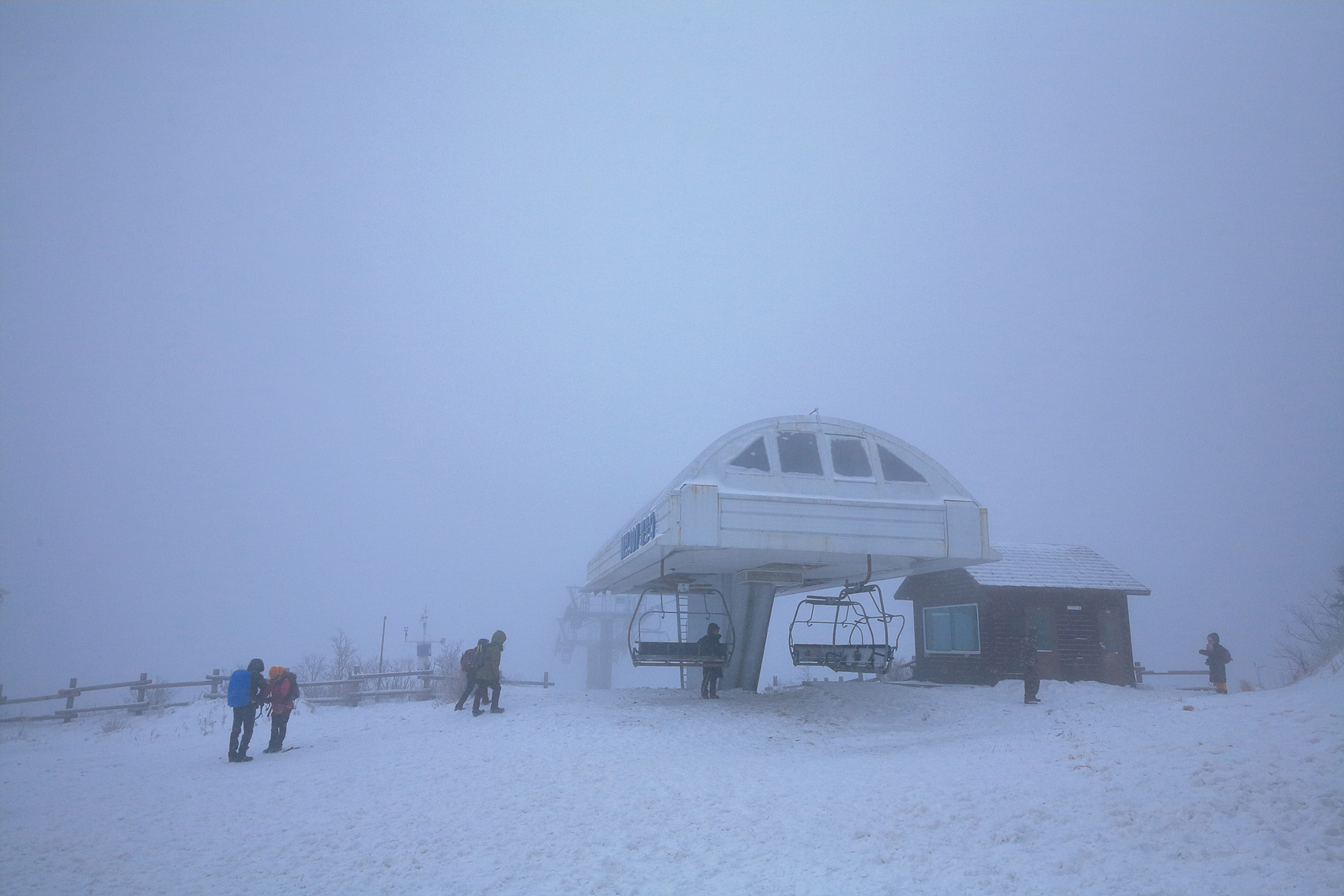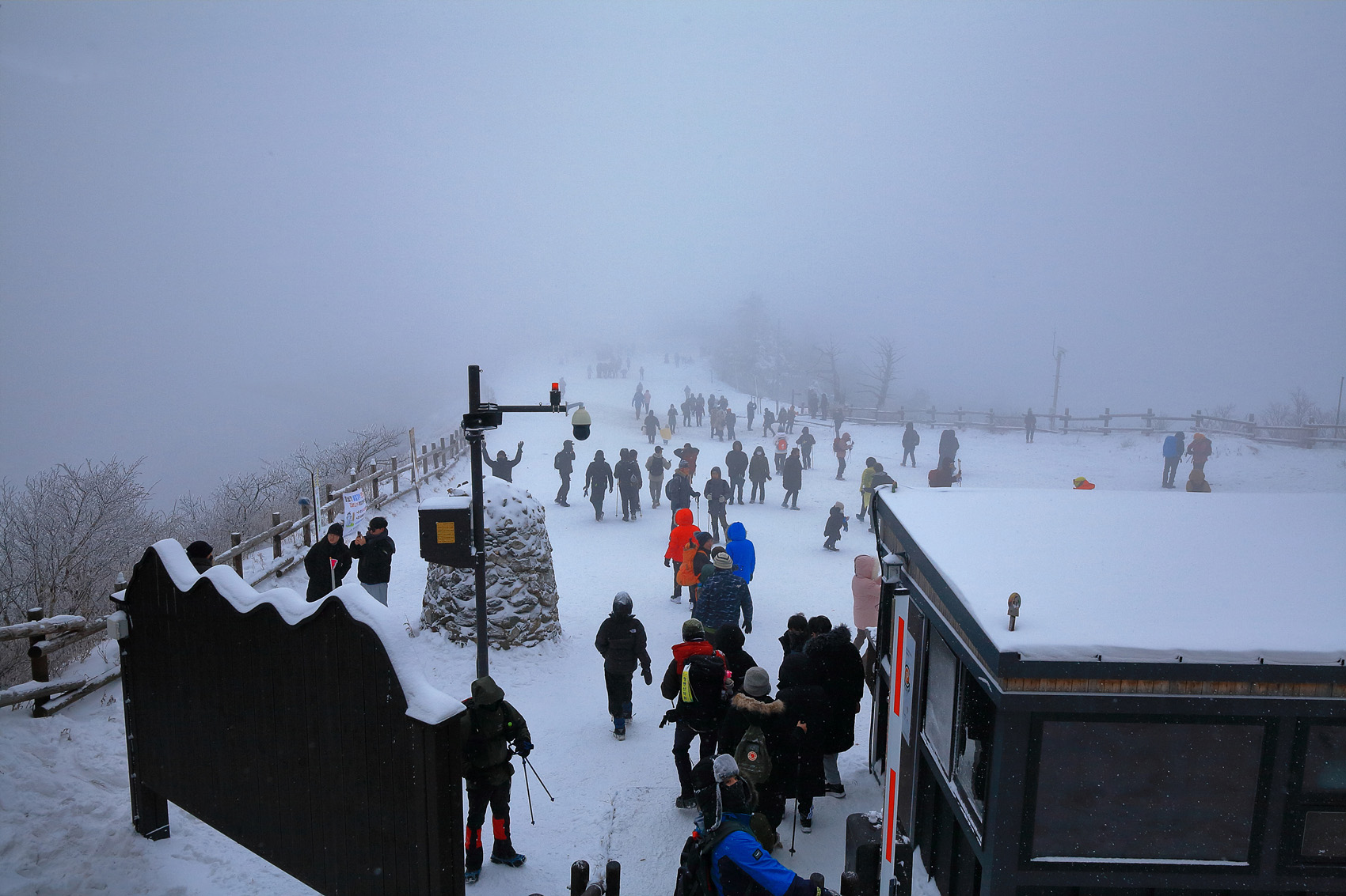 칼바람에 눈 맞으며 대피소 처마밑에서