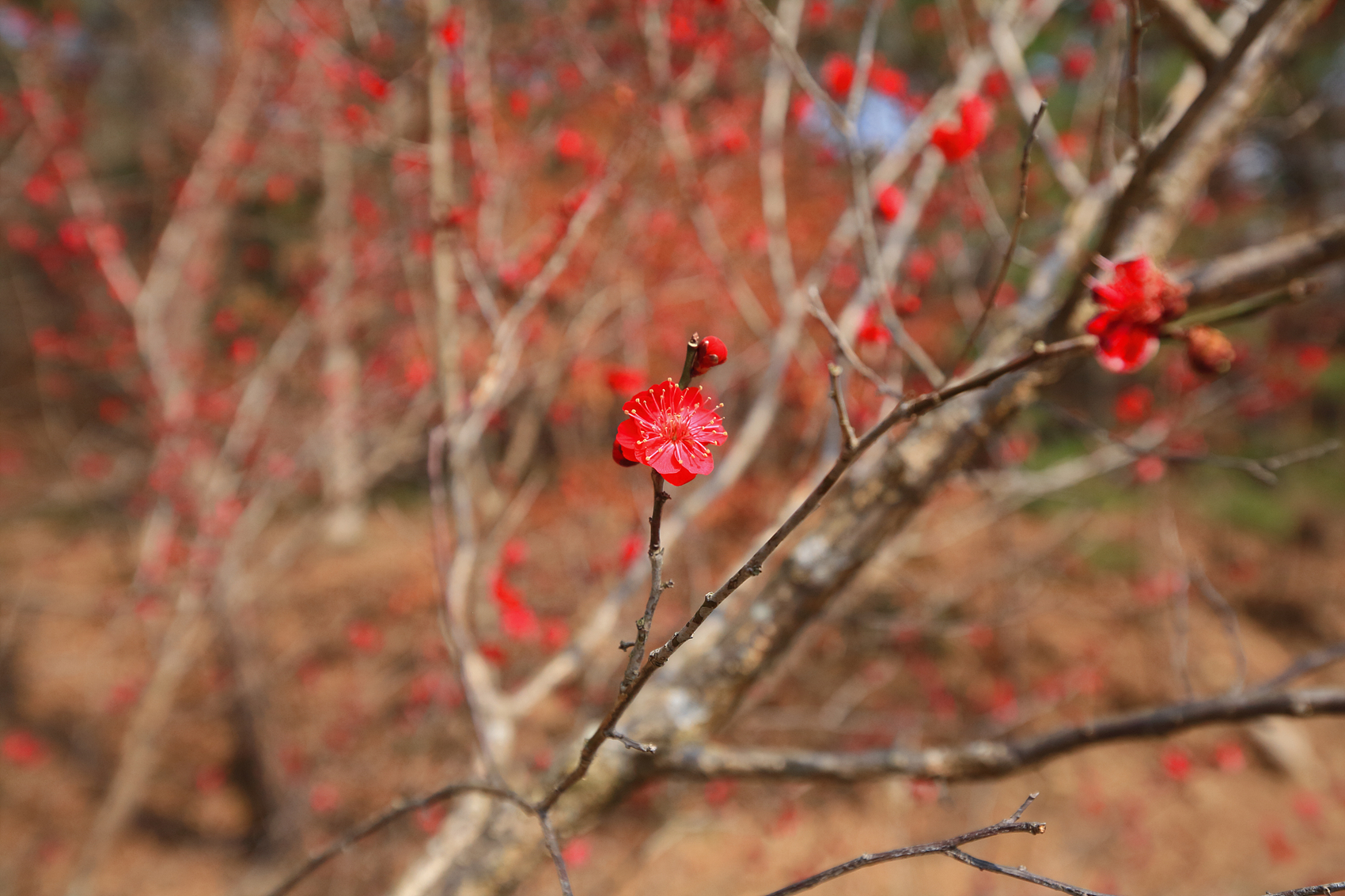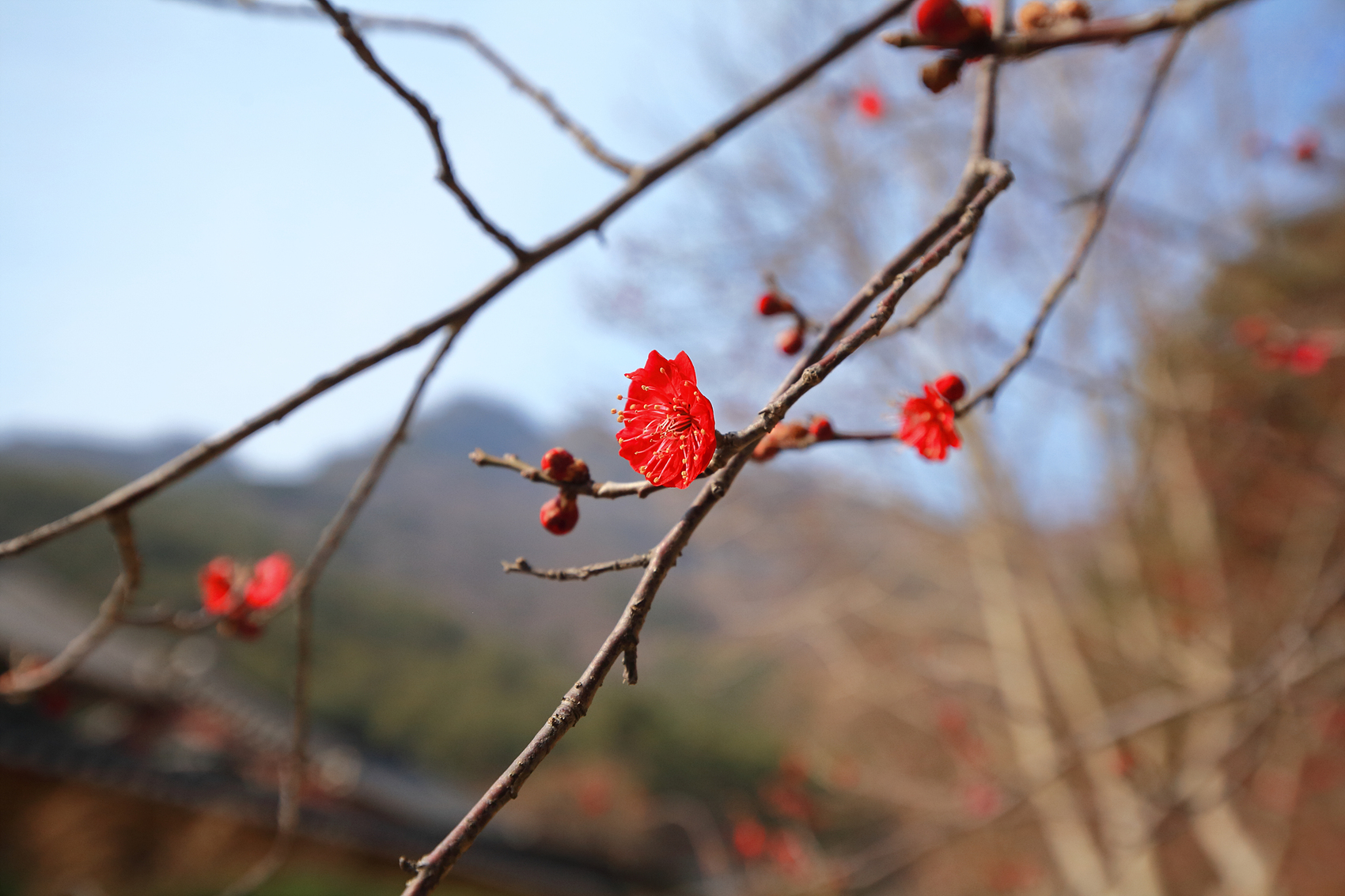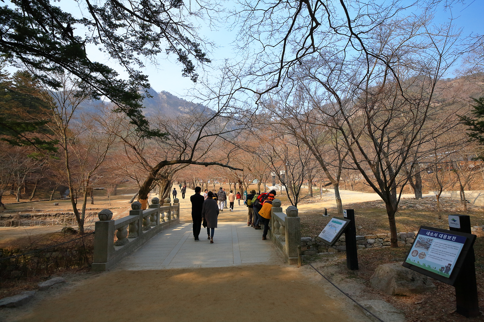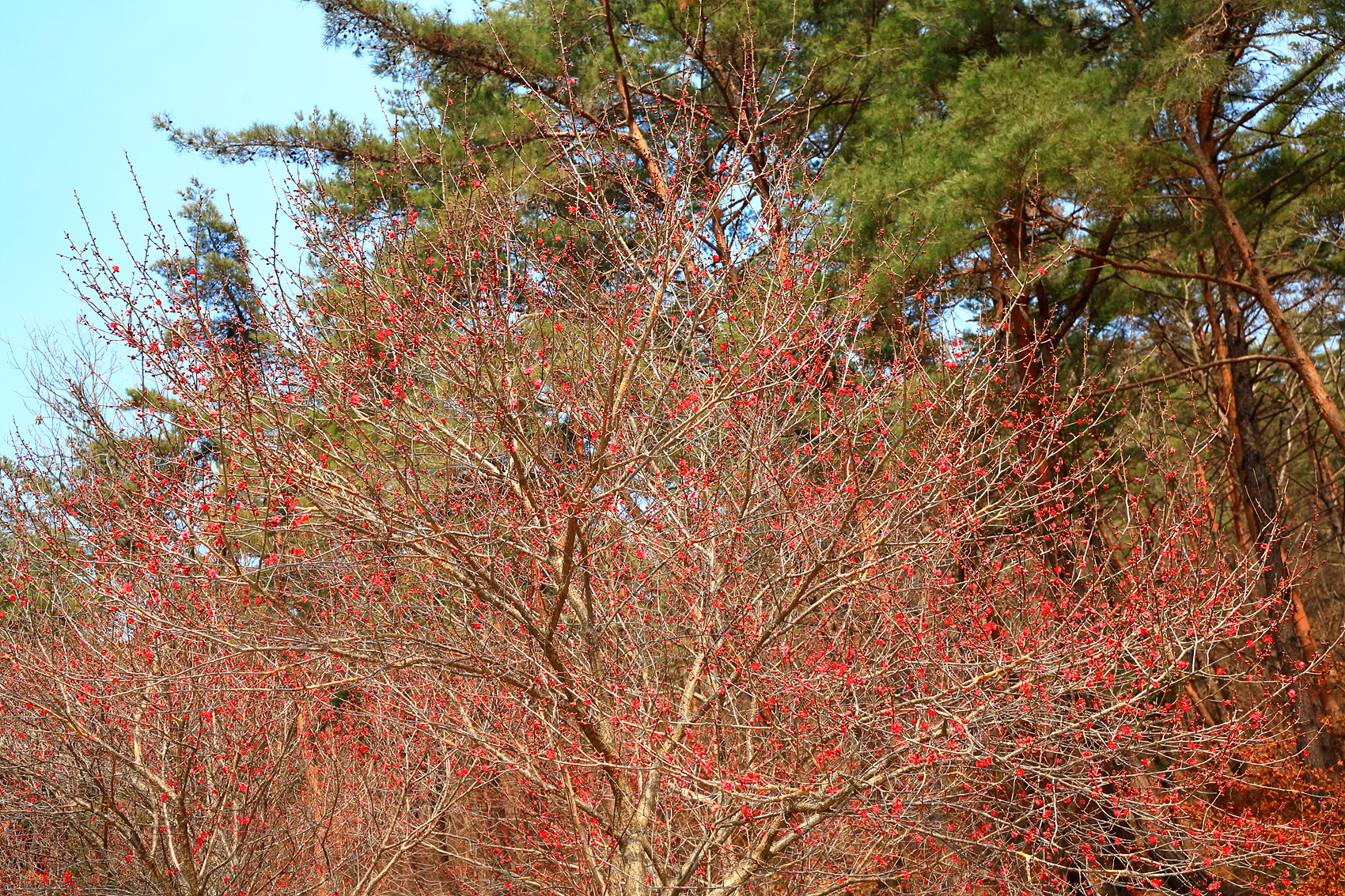 내소사 경내 가로수에 홍매화가